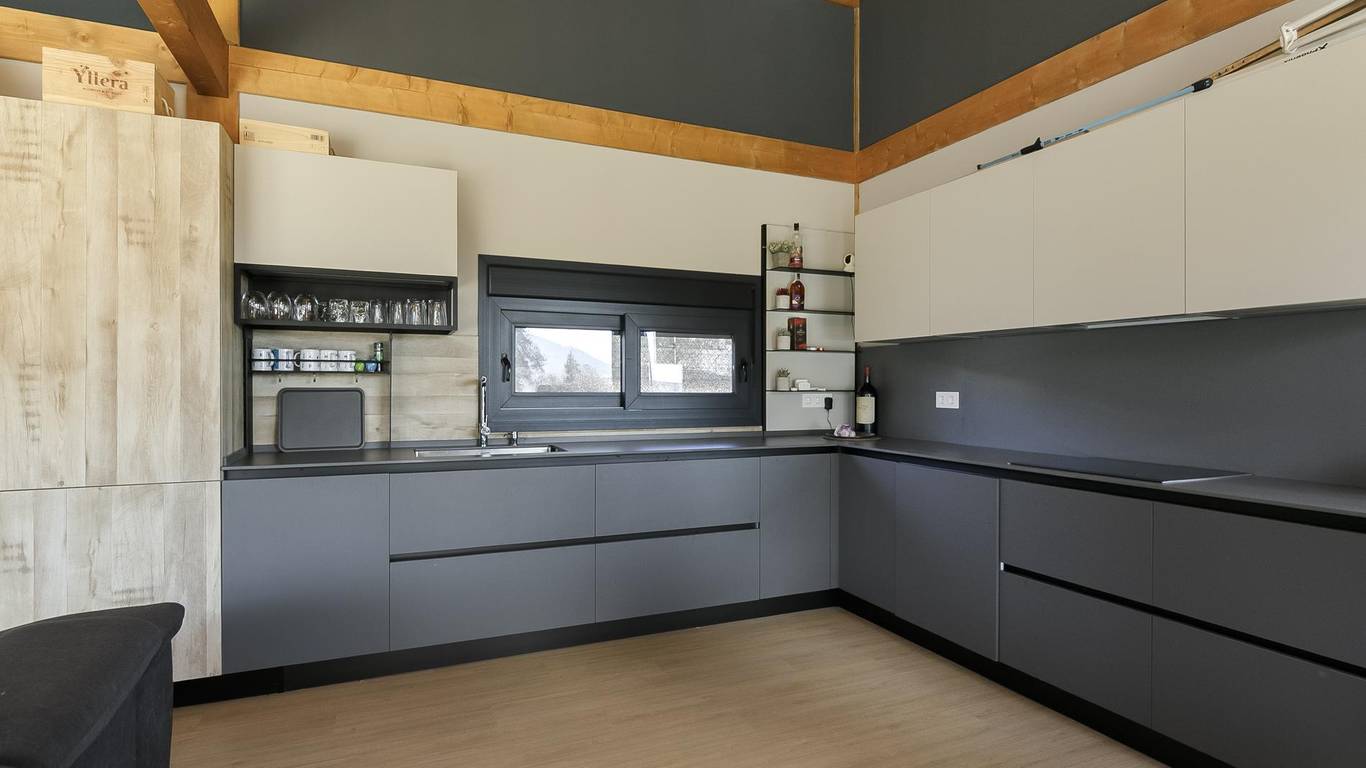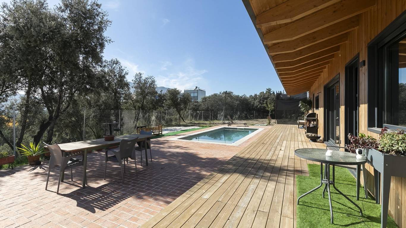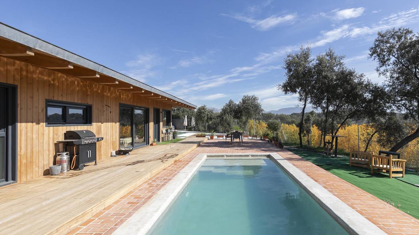 La casa está construida íntegramente en hormigón y forrada en láminas de madera natural, combinando robustez, eficiencia energética y una estética cálida y contemporánea.