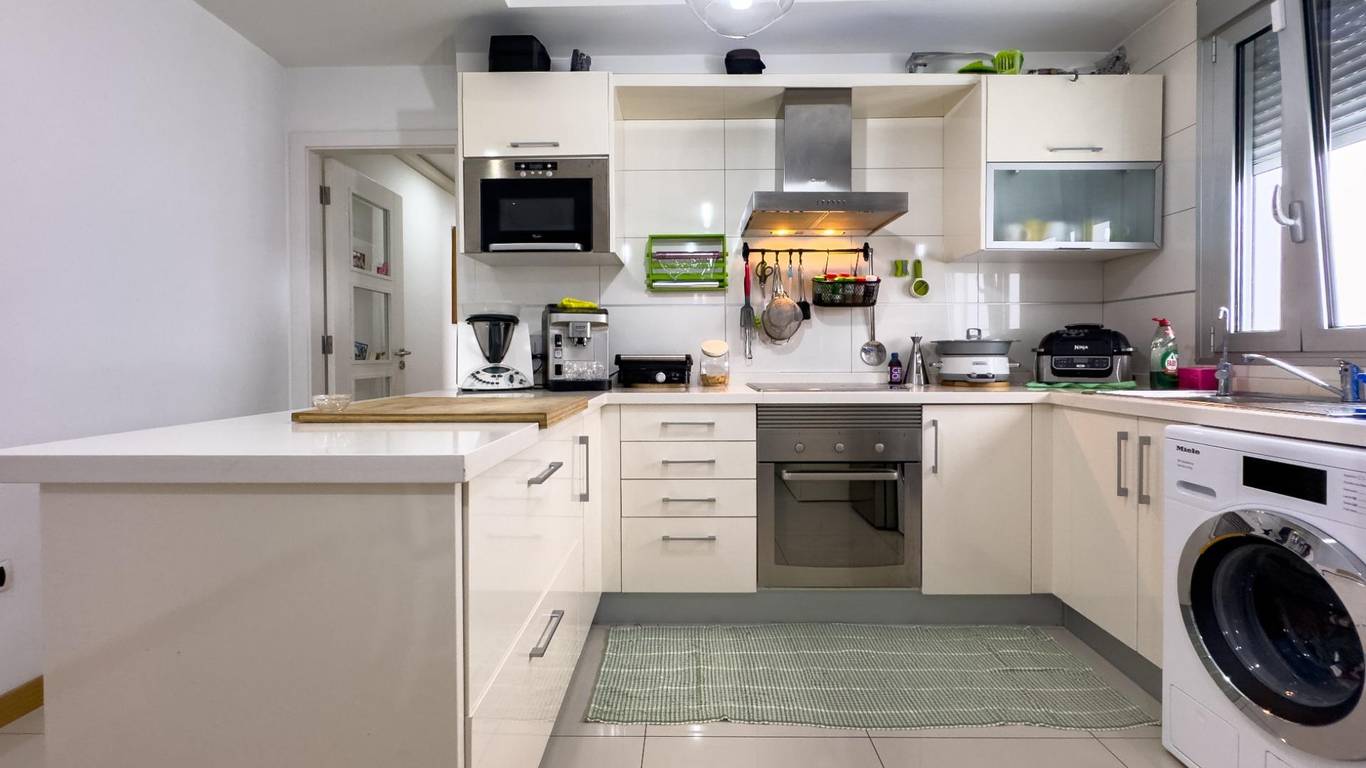 La otra ala despliega la zona más familiar: una cocina amplia en forma de U, funcional, práctica y con mucho almacenaje, seguida de tres dormitorios versátiles (dos de ellos exteriores con vistas despejadas), ideales para familias grandes, invitados, teletrabajo o espacios creativos. Un baño dividido en dos ambientes aporta comodidad y privacidad.