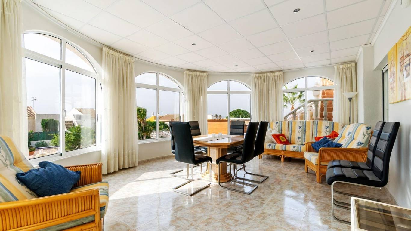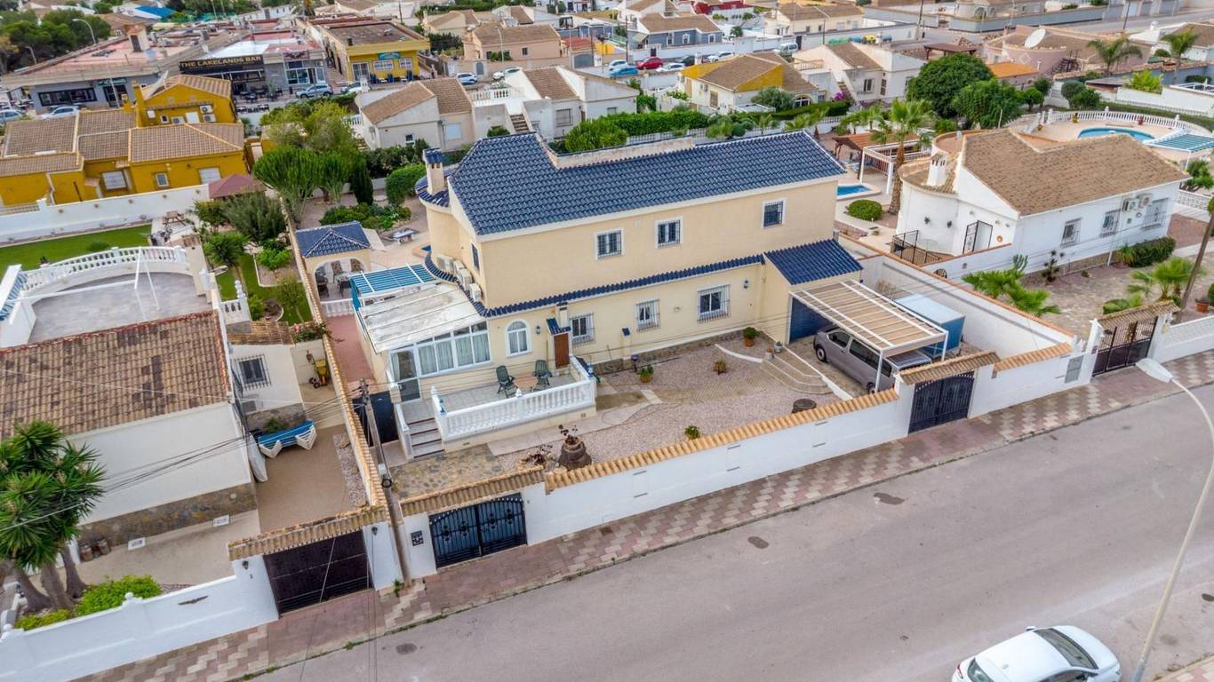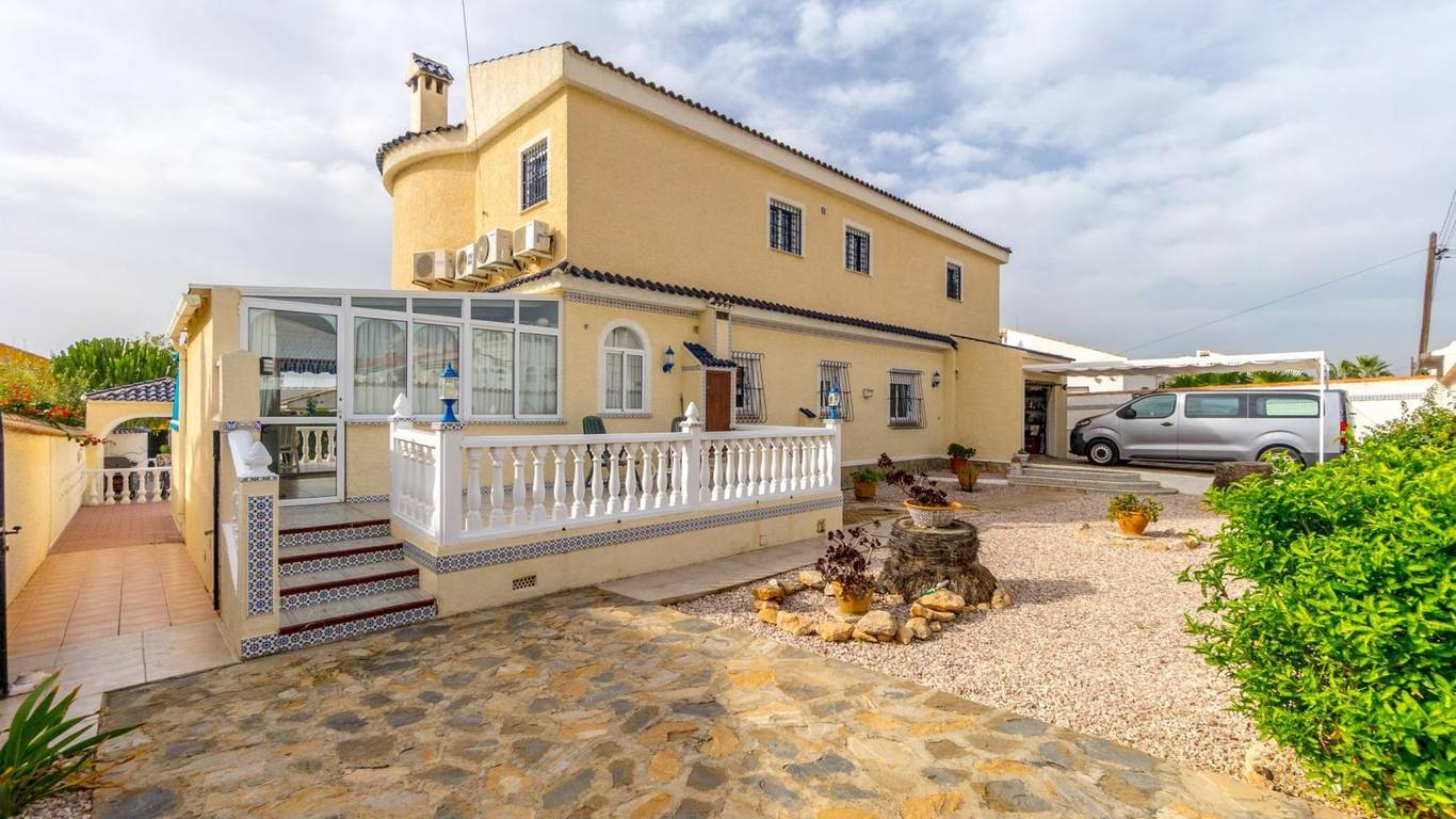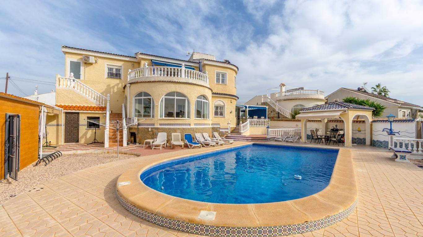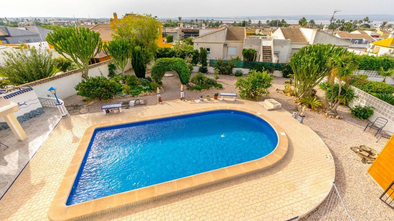 Discover this exclusive detached villa set on a 1,000 m plot with a 235 m home, located in La Siesta, one of Torreviejas most sought-after neighbourhoods thanks to its tranquillity, residential atmosphere and excellent quality of life. A location where youll enjoy nearby services, large supermarkets, natural walking areas, the renewed La Siesta Park a green oasis perfect for relaxing, exercising or enjoying time with family and only a short drive from the centre of Torrevieja and its beaches.The property stands out for its space and privacy. Outside, you will find a mature garden with fruit trees, landscaped areas and various relaxing corners, outdoor dining spaces, a built-in gazebo, a pergola/awning area, and a beautiful private pool to enjoy the Mediterranean climate all year long. The plot also includes two spacious storage rooms / laundry areas and a closed garage.The villa is distributed over two independent levels, ideal for large families, guests or even as a rental opportunity.Ground floor: 2 bedrooms 3 bathrooms (2 en suite) Living-dining room with fireplace Fully equipped American-style kitchen 2 glazed terraces, one overlooking the garden and pool the perfect spot for gatherings and celebrationsFirst floor (internal staircase plus independent entrance from the garden): 2 bedrooms 2 bathrooms Living room and open-plan kitchen with dining area Terrace with open views of the lagoons, ideal for enjoying the sun all year roundThe home is sold furnished and, thanks to its multiple orientations, it enjoys abundant natural light, creating warmth and comfort throughout.If you are looking for a spacious, bright home with privacy, outdoor living spaces and located in one of Torreviejas most comfortable and peaceful areas this is your opportunity.We invite you to visit and experience everything this home has to offer.