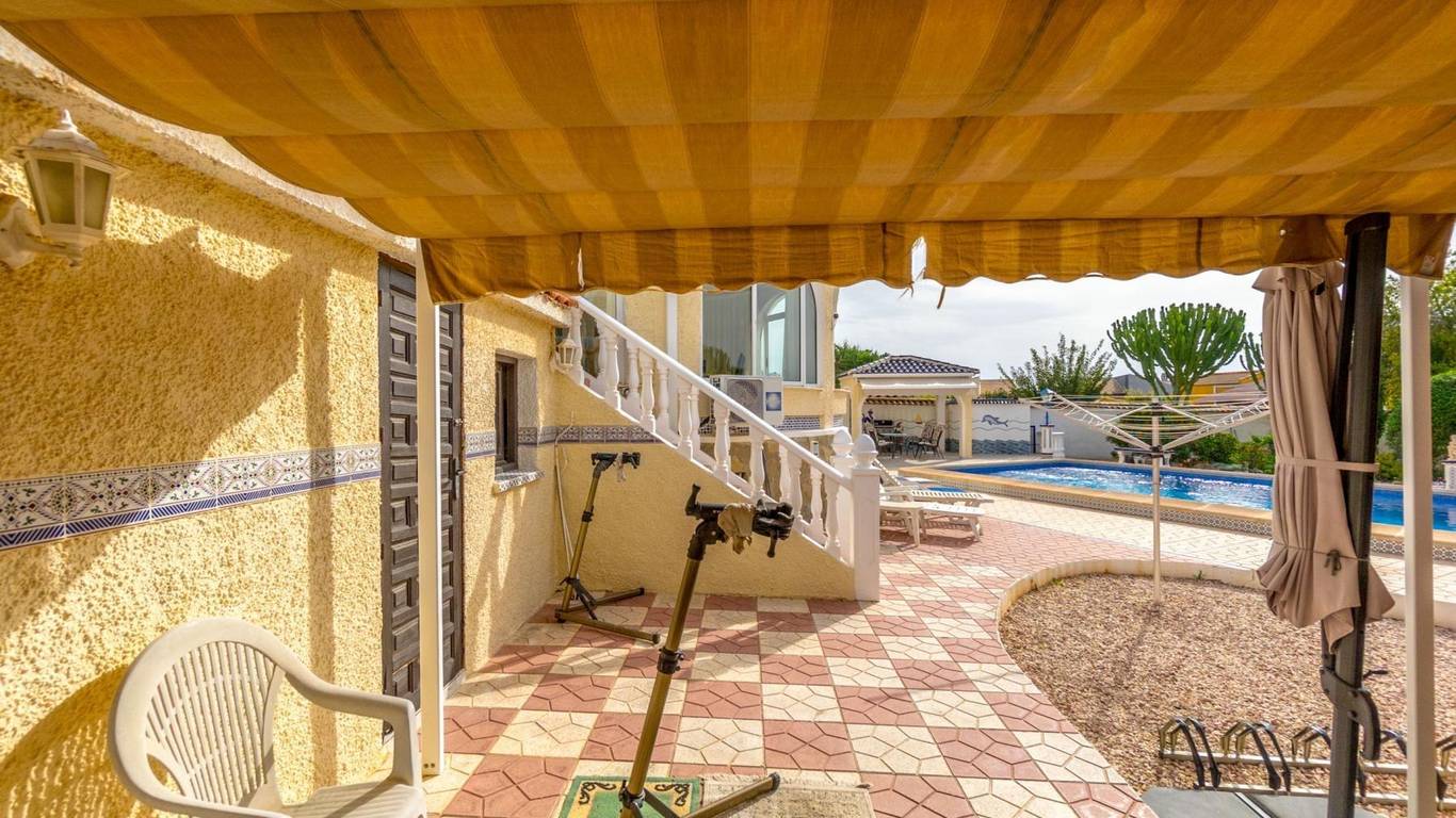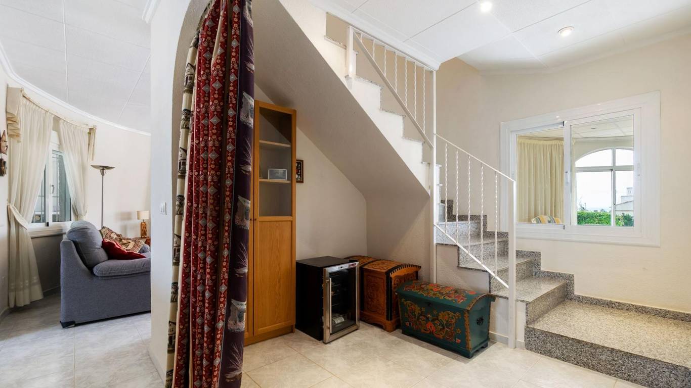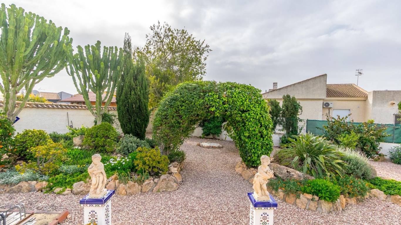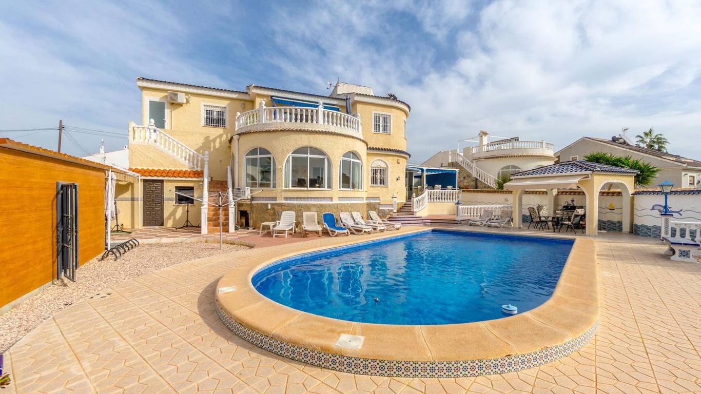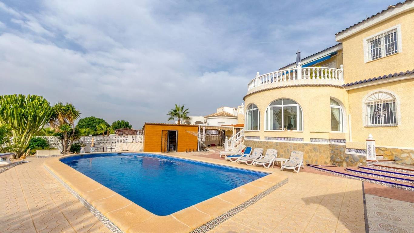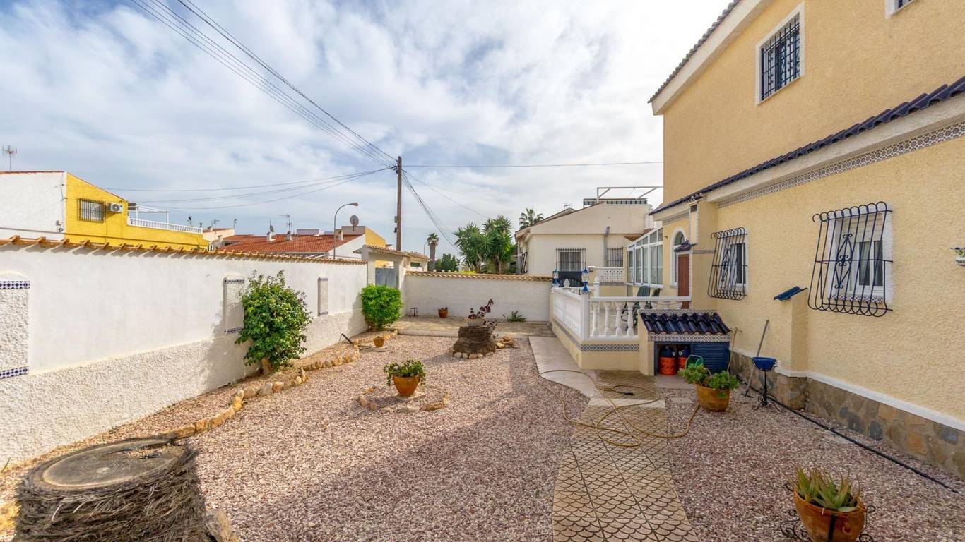 Discover this exclusive detached villa set on a 1,000 m plot with a 235 m home, located in La Siesta, one of Torreviejas most sought-after neighbourhoods thanks to its tranquillity, residential atmosphere and excellent quality of life. A location where youll enjoy nearby services, large supermarkets, natural walking areas, the renewed La Siesta Park a green oasis perfect for relaxing, exercising or enjoying time with family and only a short drive from the centre of Torrevieja and its beaches.The property stands out for its space and privacy. Outside, you will find a mature garden with fruit trees, landscaped areas and various relaxing corners, outdoor dining spaces, a built-in gazebo, a pergola/awning area, and a beautiful private pool to enjoy the Mediterranean climate all year long. The plot also includes two spacious storage rooms / laundry areas and a closed garage.The villa is distributed over two independent levels, ideal for large families, guests or even as a rental opportunity.Ground floor: 2 bedrooms 3 bathrooms (2 en suite) Living-dining room with fireplace Fully equipped American-style kitchen 2 glazed terraces, one overlooking the garden and pool the perfect spot for gatherings and celebrationsFirst floor (internal staircase plus independent entrance from the garden): 2 bedrooms 2 bathrooms Living room and open-plan kitchen with dining area Terrace with open views of the lagoons, ideal for enjoying the sun all year roundThe home is sold furnished and, thanks to its multiple orientations, it enjoys abundant natural light, creating warmth and comfort throughout.If you are looking for a spacious, bright home with privacy, outdoor living spaces and located in one of Torreviejas most comfortable and peaceful areas this is your opportunity.We invite you to visit and experience everything this home has to offer.