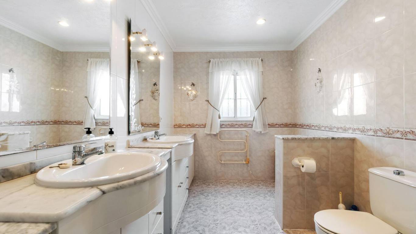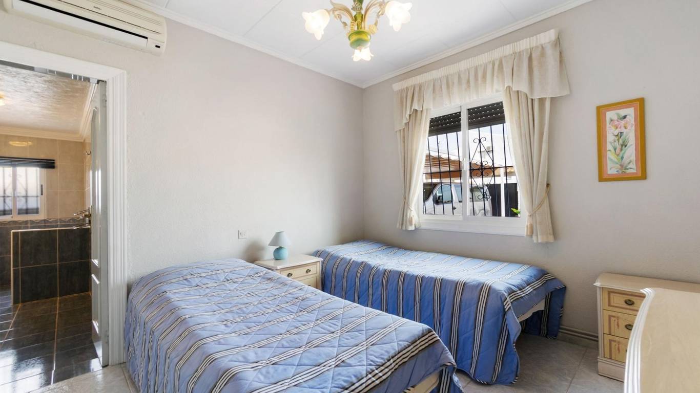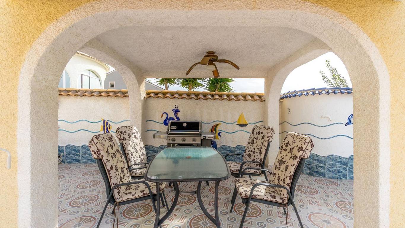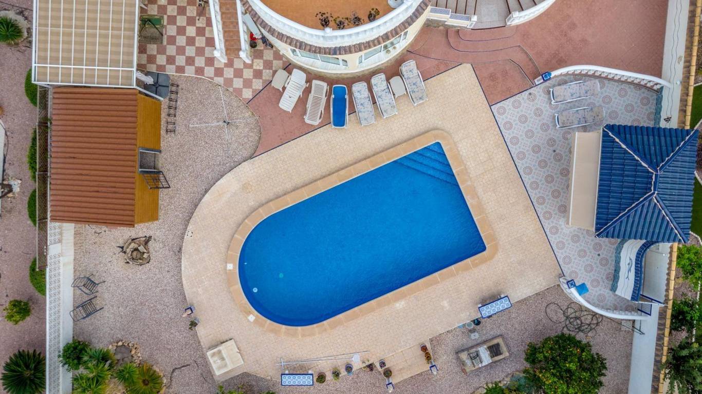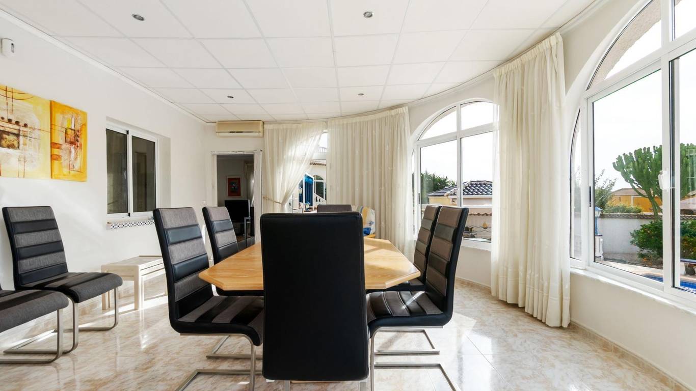 Discover this exclusive detached villa set on a 1,000 m plot with a 235 m home, located in La Siesta, one of Torreviejas most sought-after neighbourhoods thanks to its tranquillity, residential atmosphere and excellent quality of life. A location where youll enjoy nearby services, large supermarkets, natural walking areas, the renewed La Siesta Park a green oasis perfect for relaxing, exercising or enjoying time with family and only a short drive from the centre of Torrevieja and its beaches.The property stands out for its space and privacy. Outside, you will find a mature garden with fruit trees, landscaped areas and various relaxing corners, outdoor dining spaces, a built-in gazebo, a pergola/awning area, and a beautiful private pool to enjoy the Mediterranean climate all year long. The plot also includes two spacious storage rooms / laundry areas and a closed garage.The villa is distributed over two independent levels, ideal for large families, guests or even as a rental opportunity.Ground floor: 2 bedrooms 3 bathrooms (2 en suite) Living-dining room with fireplace Fully equipped American-style kitchen 2 glazed terraces, one overlooking the garden and pool the perfect spot for gatherings and celebrationsFirst floor (internal staircase plus independent entrance from the garden): 2 bedrooms 2 bathrooms Living room and open-plan kitchen with dining area Terrace with open views of the lagoons, ideal for enjoying the sun all year roundThe home is sold furnished and, thanks to its multiple orientations, it enjoys abundant natural light, creating warmth and comfort throughout.If you are looking for a spacious, bright home with privacy, outdoor living spaces and located in one of Torreviejas most comfortable and peaceful areas this is your opportunity.We invite you to visit and experience everything this home has to offer.