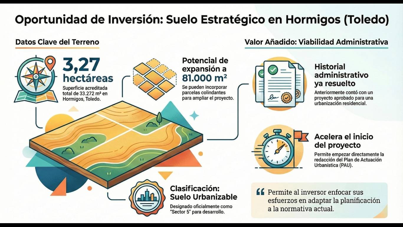 Esta venta representa la oportunidad de adquirir un suelo estratégicamente ubicado y con el historial administrativo resuelto, permitiendo a la nueva propiedad iniciar la redacción del Plan de Actuación Urbanística (PAU) ajustado a la normativa vigente de Castilla-La Mancha, maximizando la edificabilidad y el diseño.