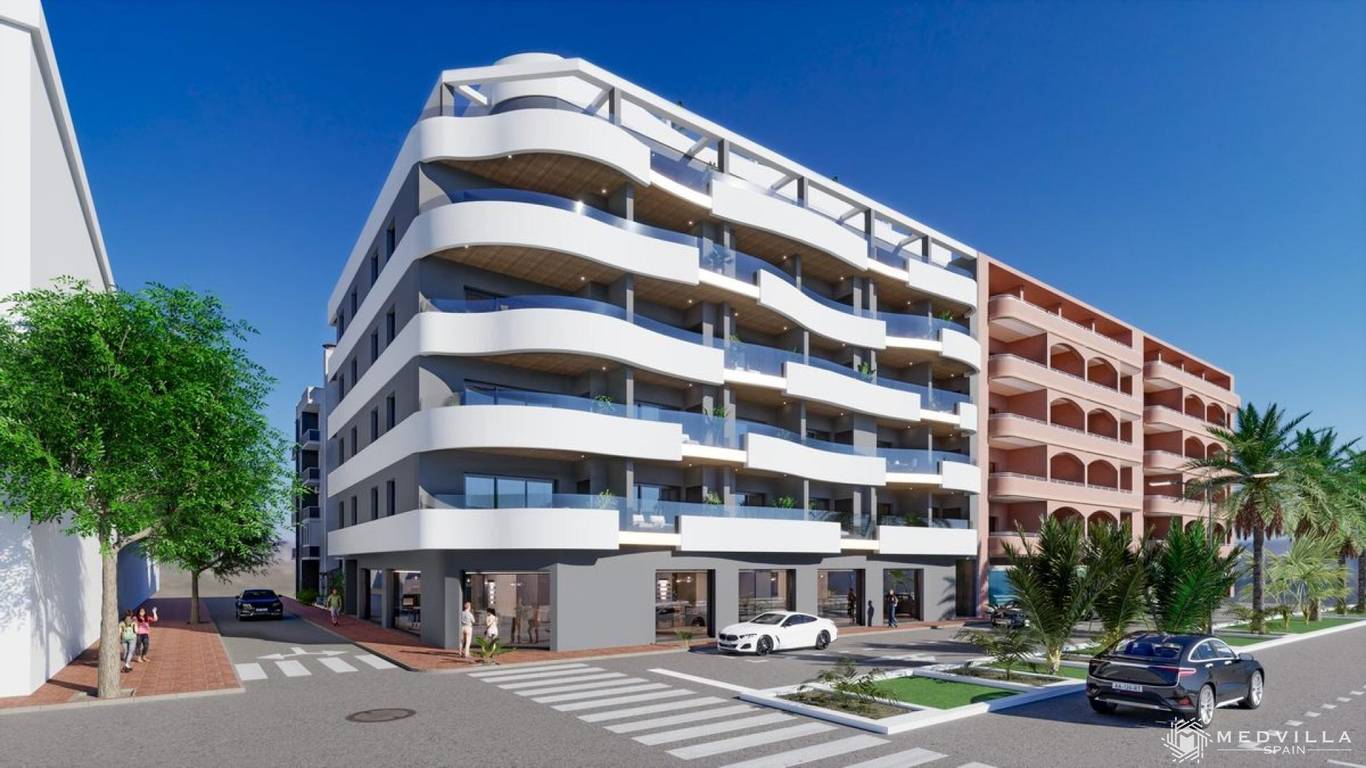 Complex with a total of 34 apartments. There is a choice of 2 or 3 bedroom apartments or penthouses. With underground parking space and storage room. Located in the center of Torrevieja with all amenities within walking distance and just 100m from the beach.