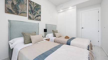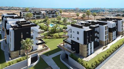 La Hoya offers apartments and penthouses with spacious terraces or private solariums, including furniture, appliances, air conditioning, underfloor heating, and electric shutters. The complex features a large swimming pool, sports and recreational facilities, underground parking, a children's playground, barbecue areas, and a beautiful pond, all behind secure access.