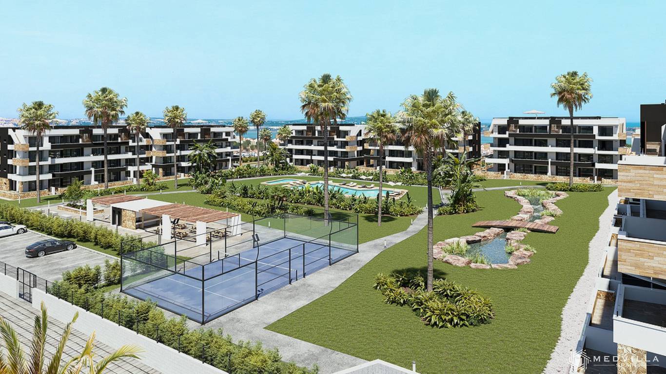 La Hoya offers apartments and penthouses with spacious terraces or private solariums, including furniture, appliances, air conditioning, underfloor heating, and electric shutters. The complex features a large swimming pool, sports and recreational facilities, underground parking, a children's playground, barbecue areas, and a beautiful pond, all behind secure access.