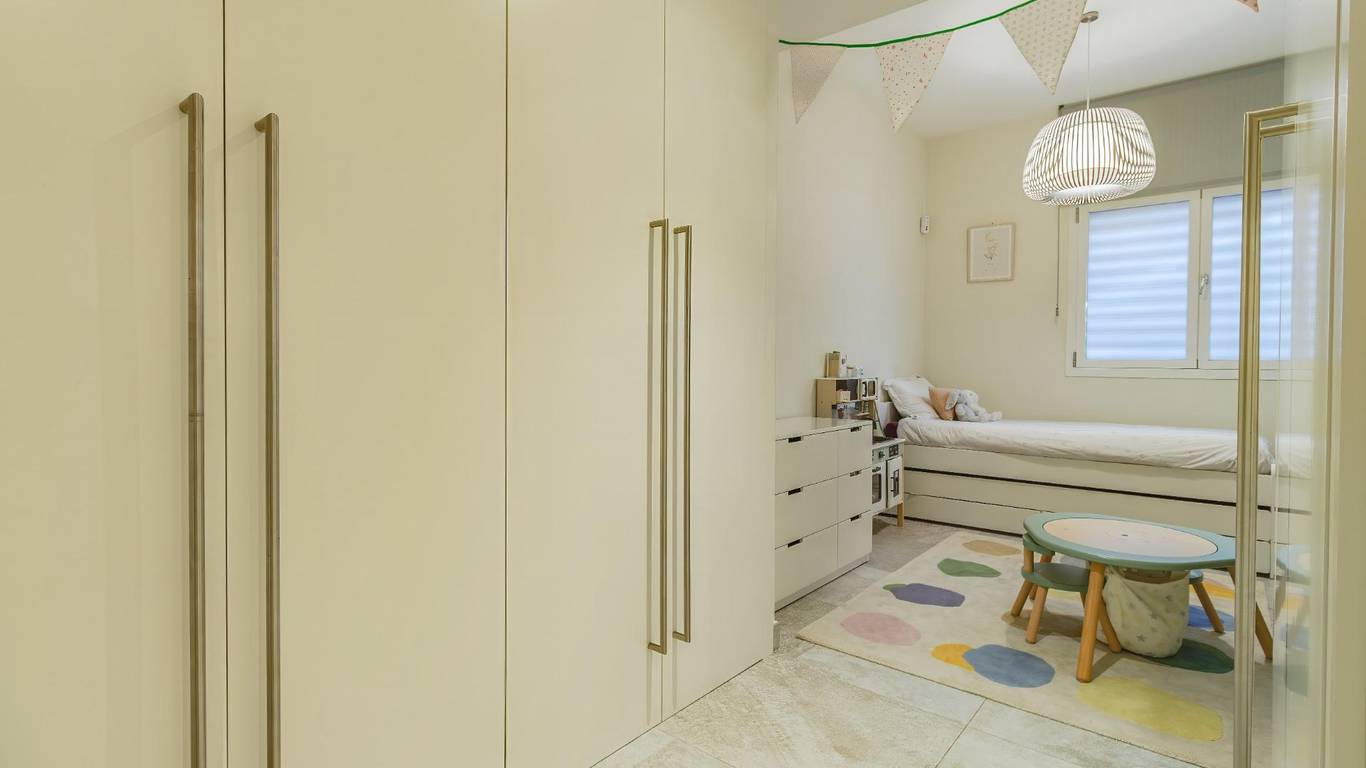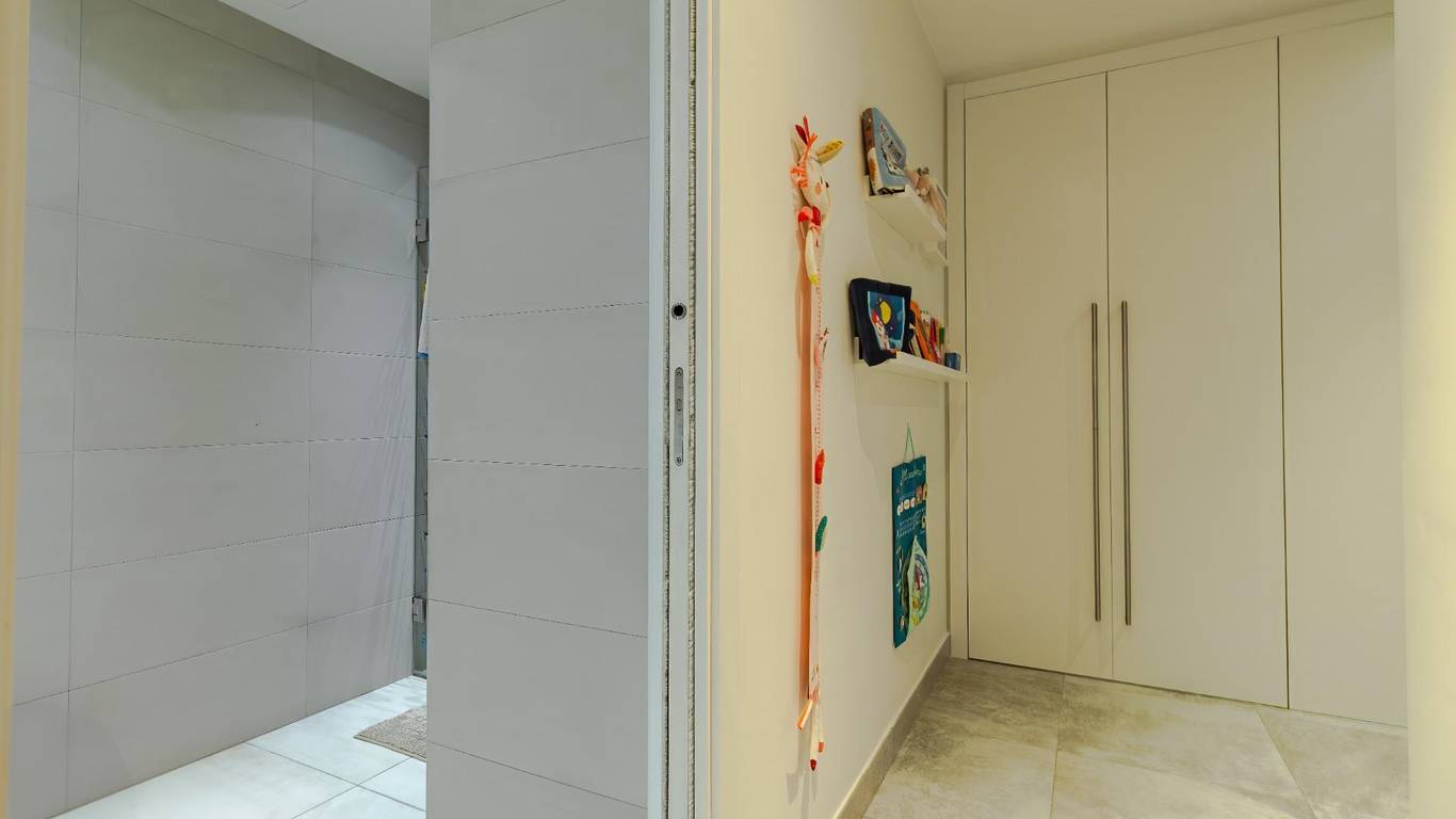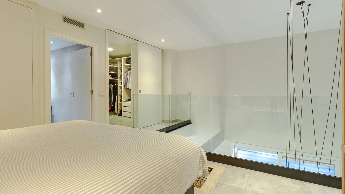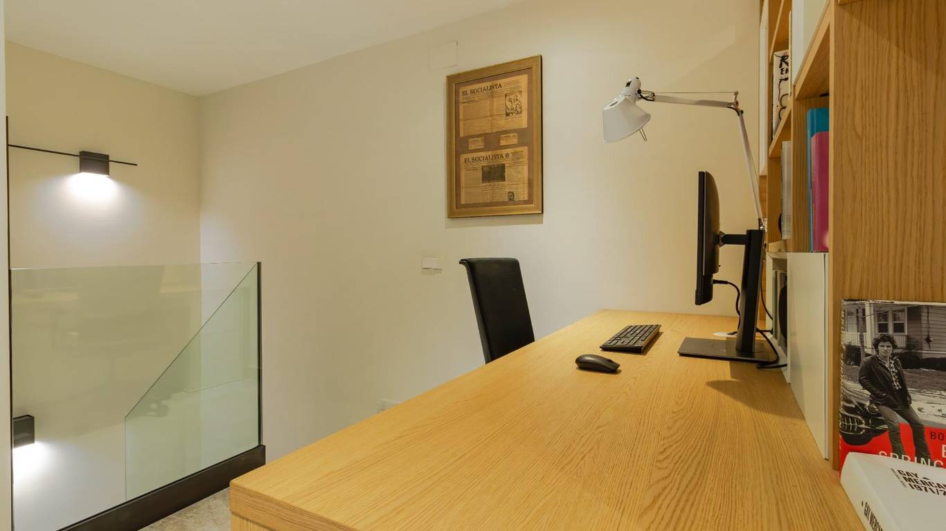 La planta superior aporta un ritmo diferente. El despacho abierto aporta un lugar perfecto para trabajar o concentrarse sin perder la conexión con el resto de la vivienda, mientras que el dormitorio principal ofrece amplitud y un vestidor con baño propio que facilita una rutina cómoda y bien organizada. En este nivel también se integra, de manera discreta dentro de un armario, la zona destinada a la colada, manteniendo la estética ordenada del espacio.