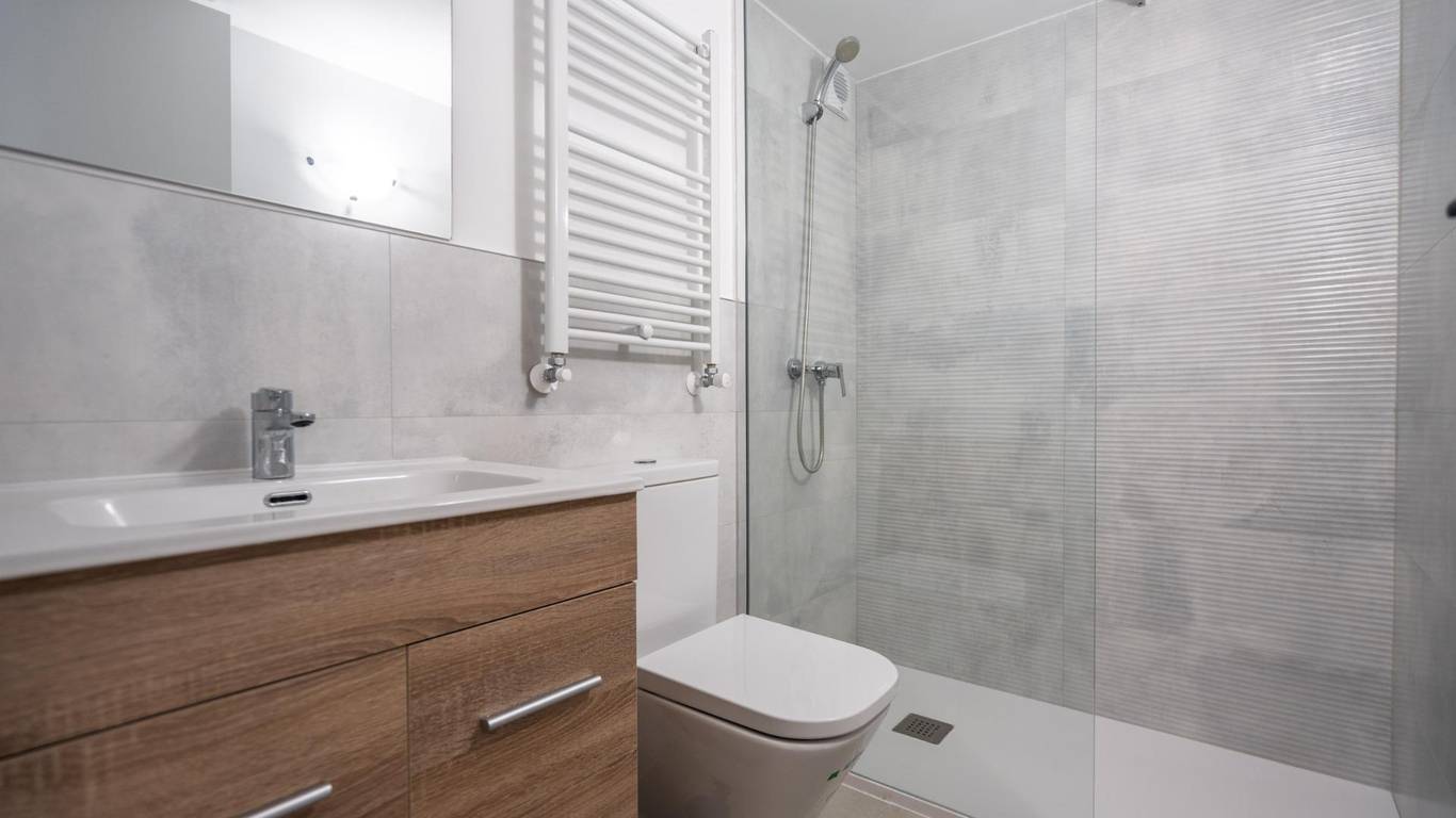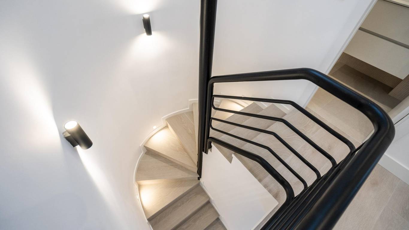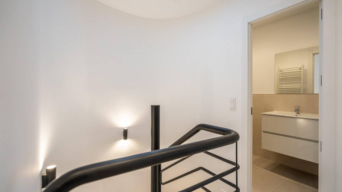 Das Haus erstreckt sich über mehrere Etagen. Im Erdgeschoss gelangt man über eine angenehme überdachte Veranda in die Eingangshalle, von der aus die Küche sowie anschließend ein großzügiges Wohnzimmer mit direktem Zugang zu einem sehr hellen Außenpatio erreichbar sind. Ebenfalls auf dieser Etage befinden sich ein Schlafzimmer sowie ein Gäste-WC, was den Alltag besonders praktisch macht.
