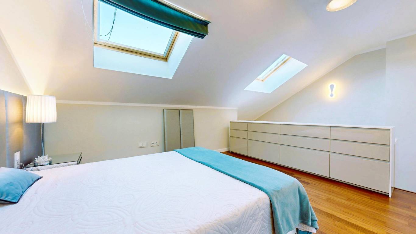 The elegant staircase leading to the upper floor connects directly to the living room, and we can go up to the attic bedroom with two windows at the top and a storage room, as well as a full bathroom with a shower. There is also a generous dressing room, and this room has split air conditioning and independent heating.