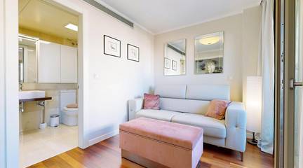 In our cosy living room, decorated with modern and functional furniture, there is a full bathroom and another room that can be separated from the living room with a sliding door, giving you the option of converting it into a bedroom with a full bathroom for your convenience if you have guests staying over or simply need to rest on its comfortable sofa bed.