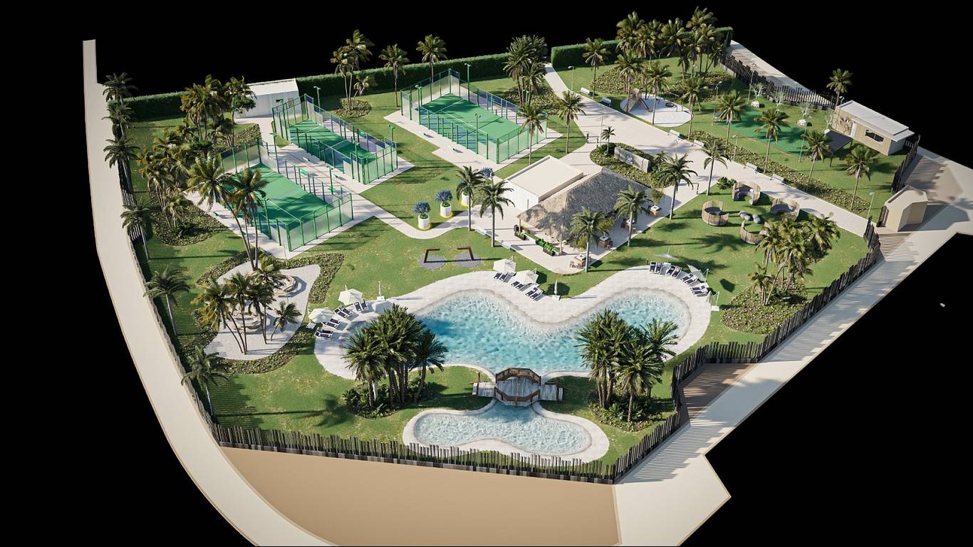 The communal areas include a large swimming pool with a waterfall, a green area with sun loungers, a playground for the little ones, and sports areas with all the necessary equipment. More good news: this development will soon have four paddle tennis and tennis courts, a bowling alley, and a bar/cafeteria opening their doors this summer!