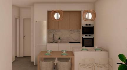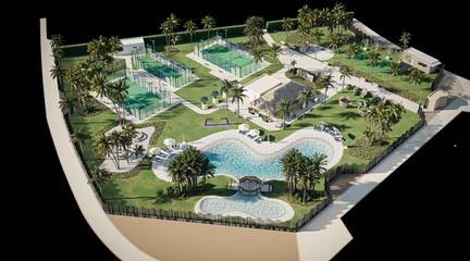 The communal areas include a large swimming pool with a waterfall, a green area with sun loungers, a playground for the little ones, and sports areas with all the necessary equipment. More good news: this development will soon have four paddle tennis and tennis courts, a bowling alley, and a bar/cafeteria opening their doors this summer!