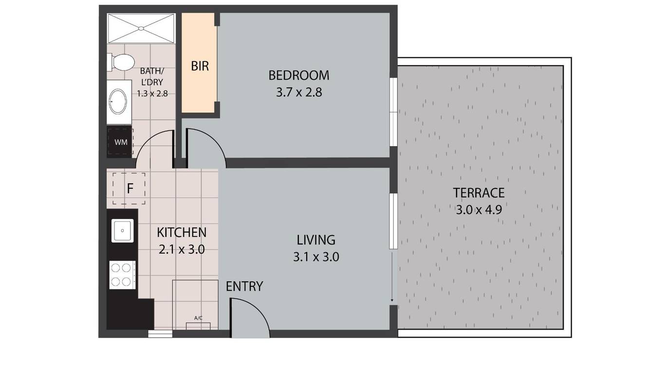 Living room with open-plan kitchen, 1 bedroom, bathroom and terrace.