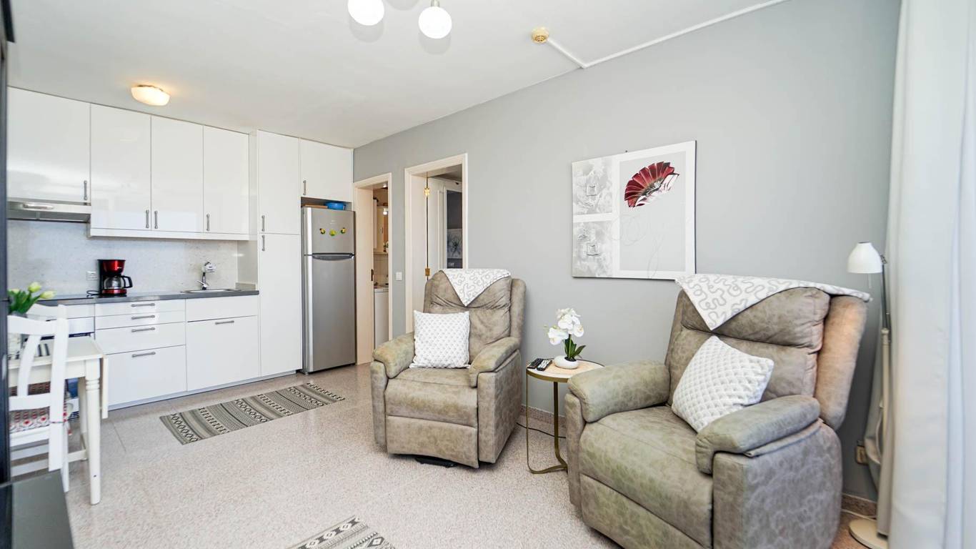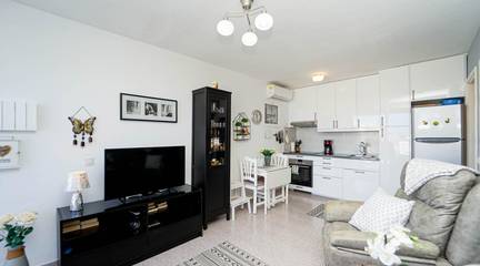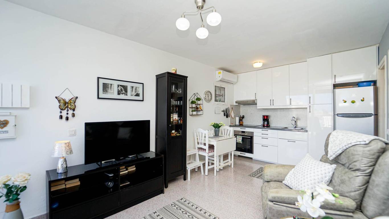 Inside, you will find a well-planned layout with one bedroom, a fully tiled bathroom, and a modern open-plan kitchen integrated with the living room. The apartment is sold furnished, so you can move in straight away and start enjoying.
