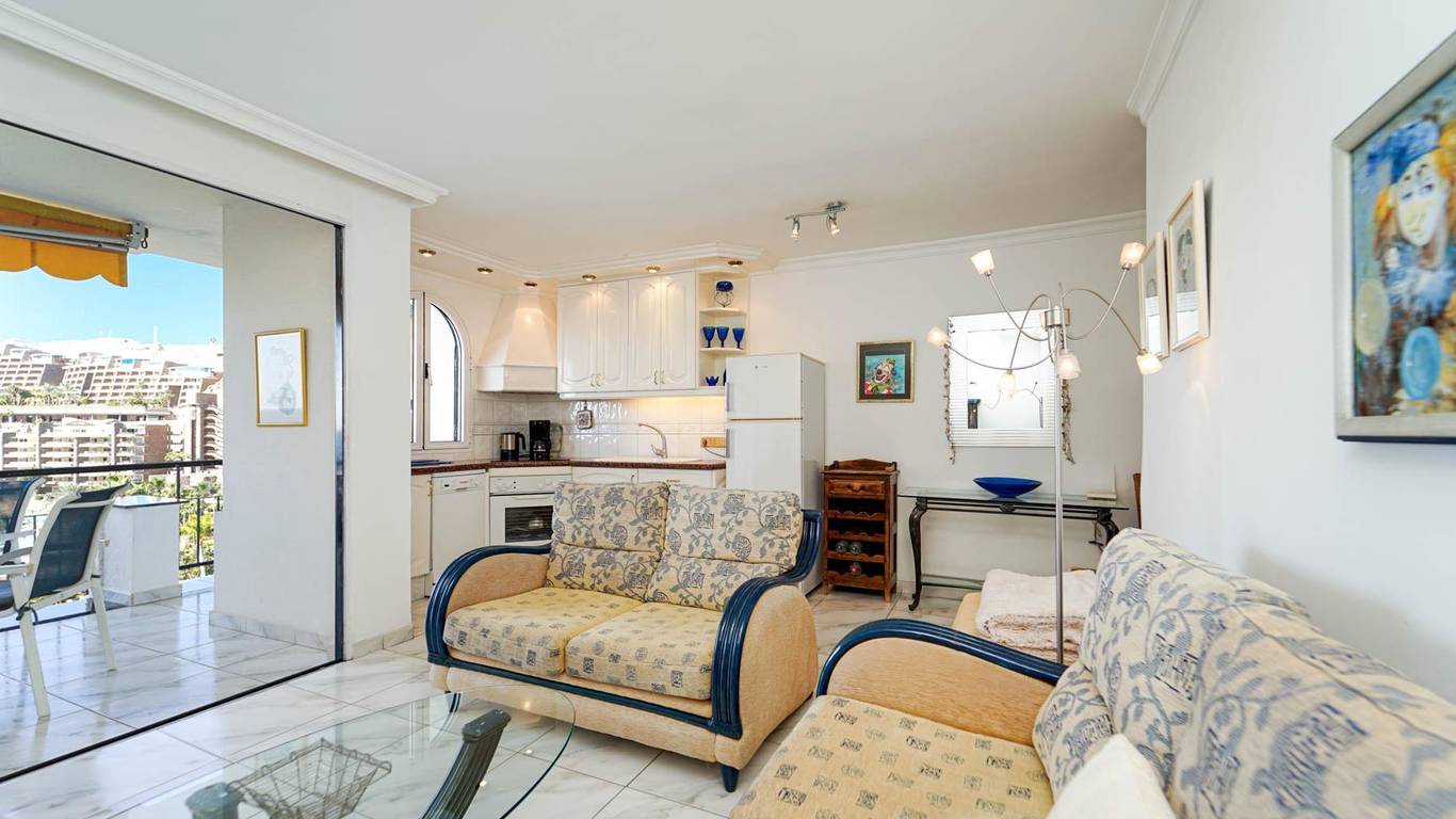 Living room with kitchen, bathroom, one bedroom and terrace.