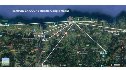 La estación de FEVE (Ferrocarril de Vía Estrecha) de Tapia de Casariego se encuentra a tan solo 7 minutos en coche y ofrece acceso a la línea (Ferrol-Oviedo) A continuación, también se detallan tiempos de viaje caminando y en coche a lugares de interés cercanos: Tiempos caminando (ver también mapa adjunto con distancias): -Tapia de Casariego (todos los servicios): 24 minutos -Puerto de Tapia de Casariego: 28 minutos -Playa del Murallón o Maleguas (Tapia de Casariego): 25 minutos -Playa de Represas (Tapia de Casariego): 28 minutos -Supermercado Alimerka: 23 minutos Tiempos en coche (ver también mapa adjunto con distancias): -Ribadeo: 15 minutos -Castropol: 11 minutos -Vegadeo: 18 minutos -Hospital de Jarrio: 15 minutos -Navia: 18 minutos -Playa de Penarronda (Monumento Natural): 9 minutos -Playa de Porcía: 8 minutos -Playa de las Catedrales: 18 minutos Y todo ello, hace que éste sea el lugar adecuado donde llevar a cabo el proyecto de tu vida y hacer realidad tus sueños No lo pienses demasiado y ven a visitarla TE ENCANTARÁ