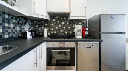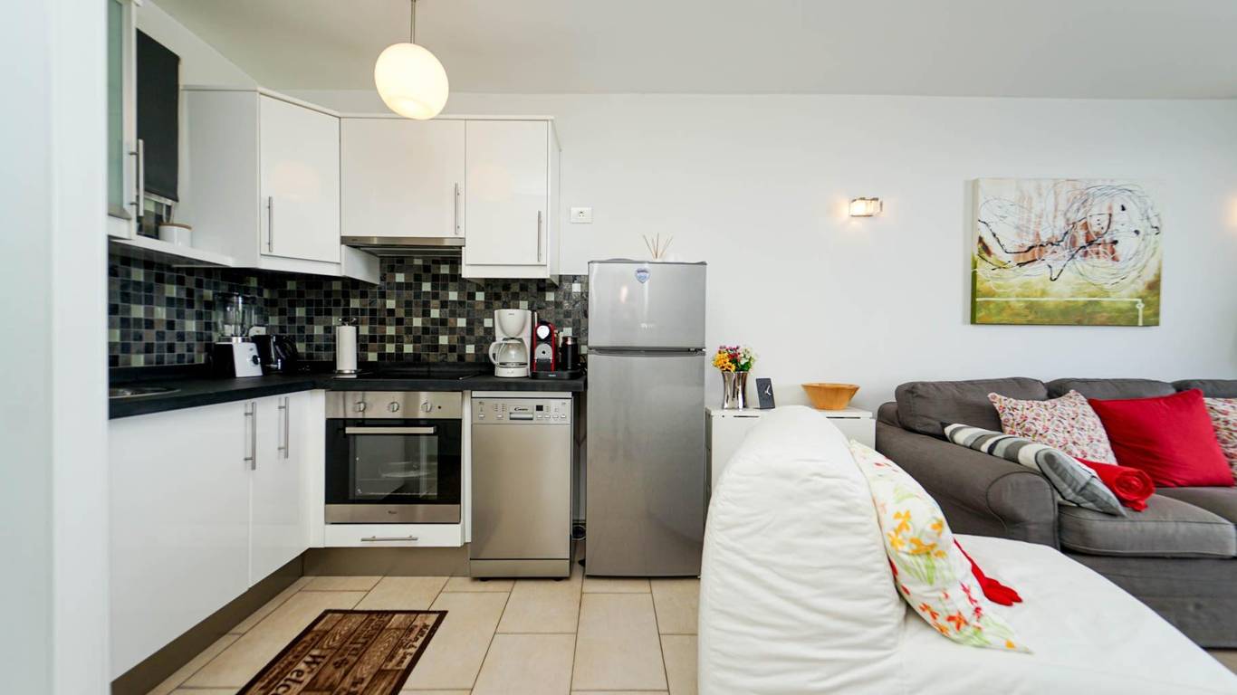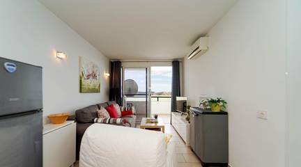 Living room with open kitchen plan, bedroom, bathroom and terrace