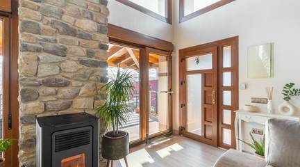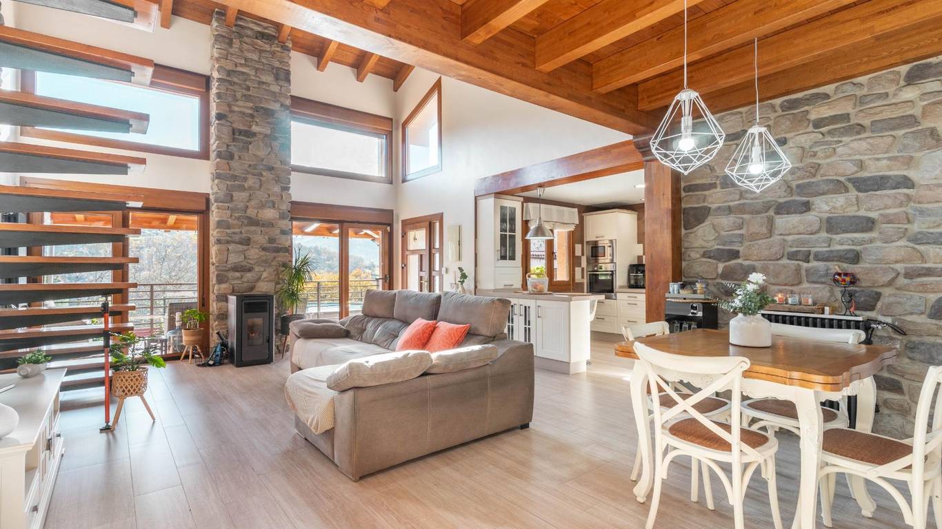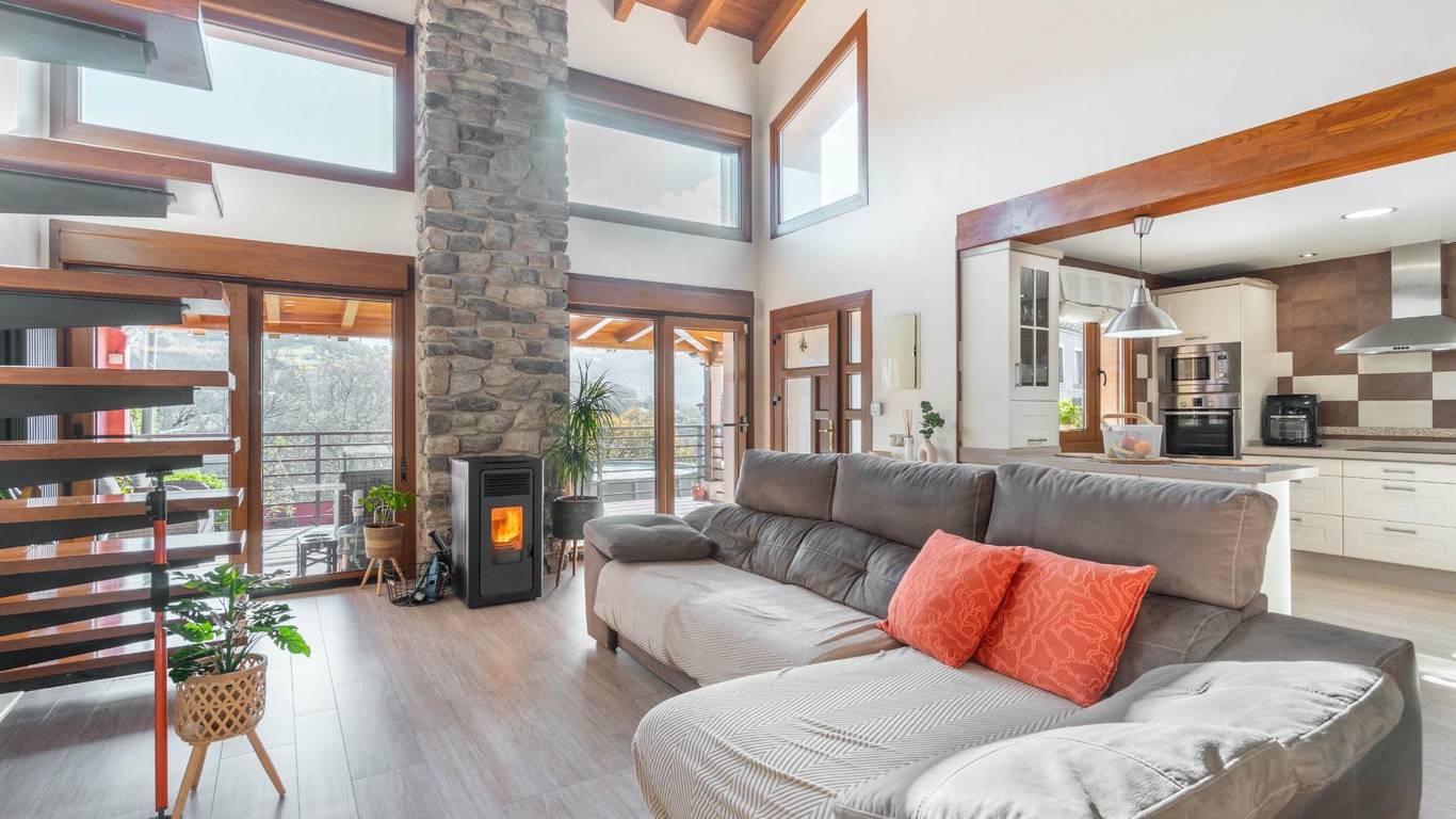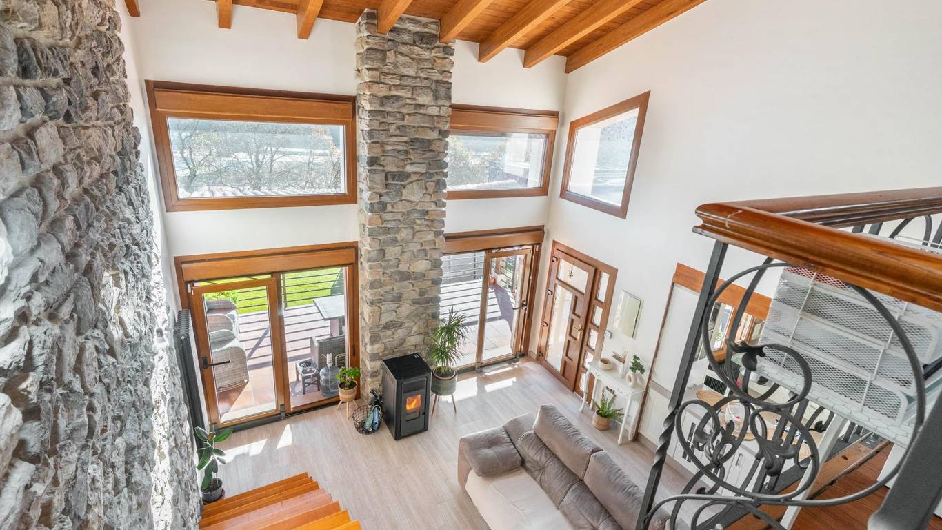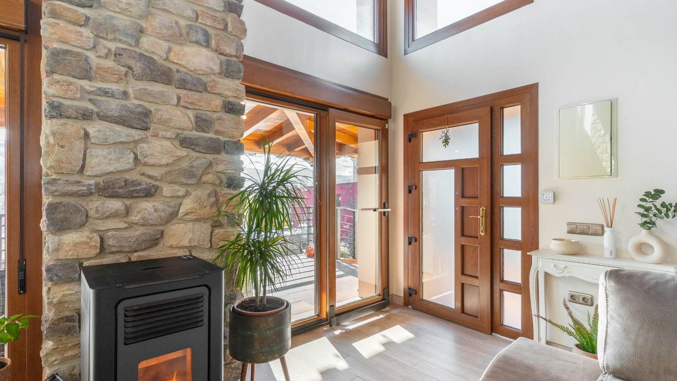 Al entrar en esta bonita propiedad nos encontramos con un espacioso hall con chimenea que comunica con el precioso salón-cocina que une comedor y da salida al majestuoso porche de suelo de Gres antideslizante que hace imposible que no nos vemos viviendo en este mágico chalet.