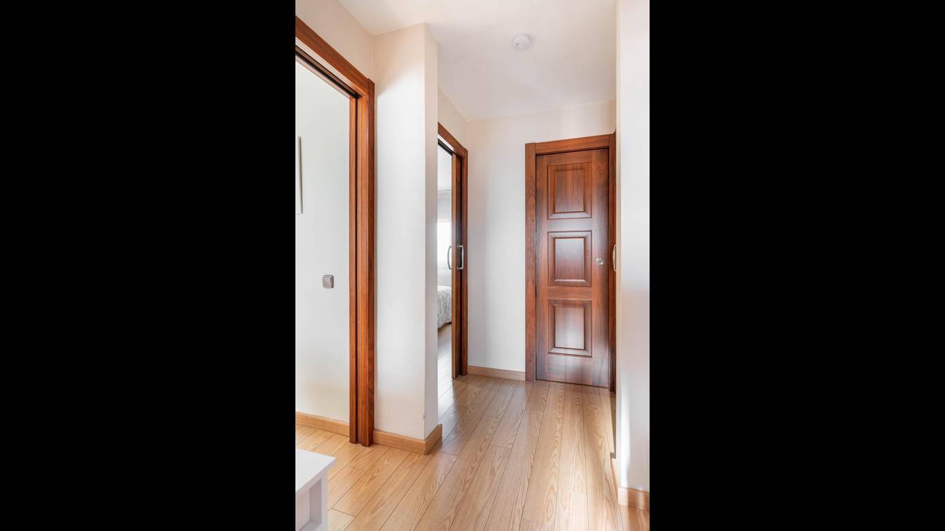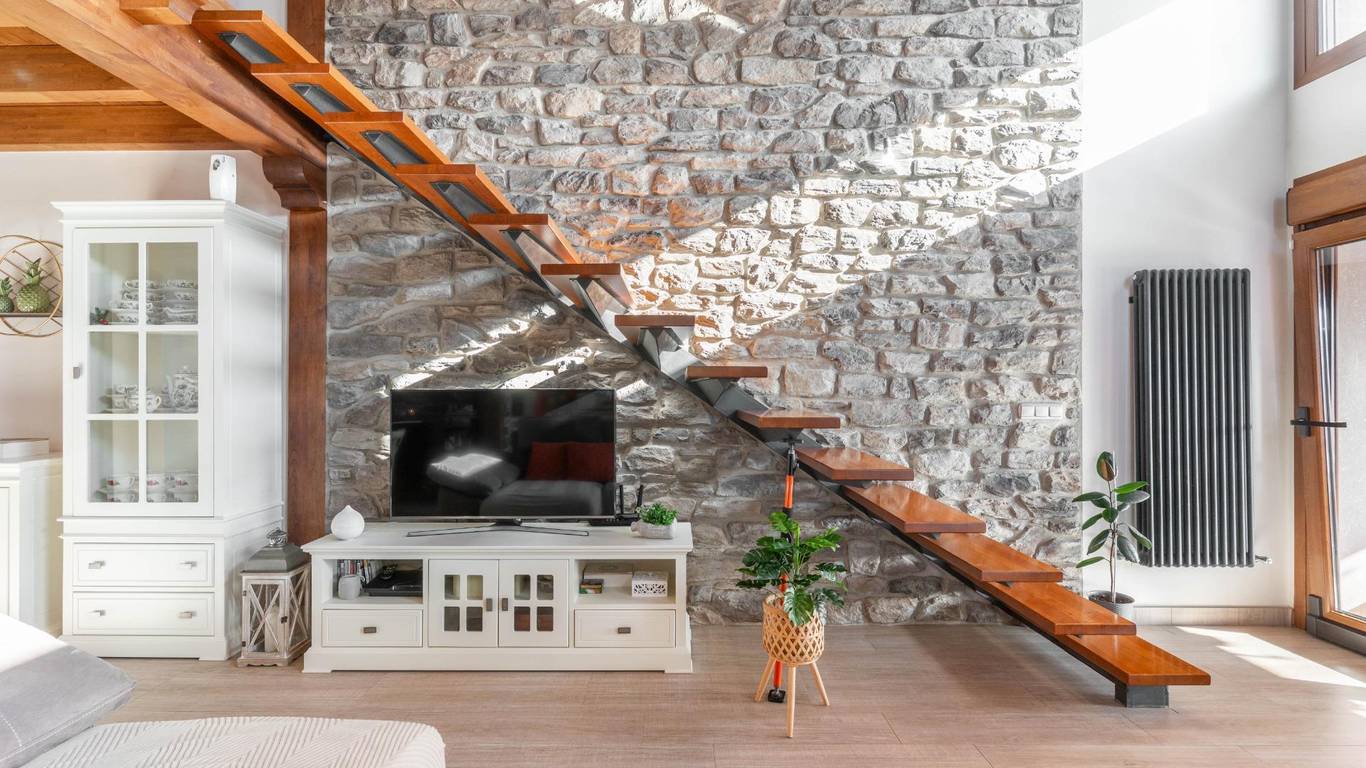 Al acceder a la primera planta observamos el diseño de las escaleras flotantes de forja y madera y todos los revestimientos de castaño macizo.