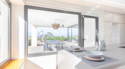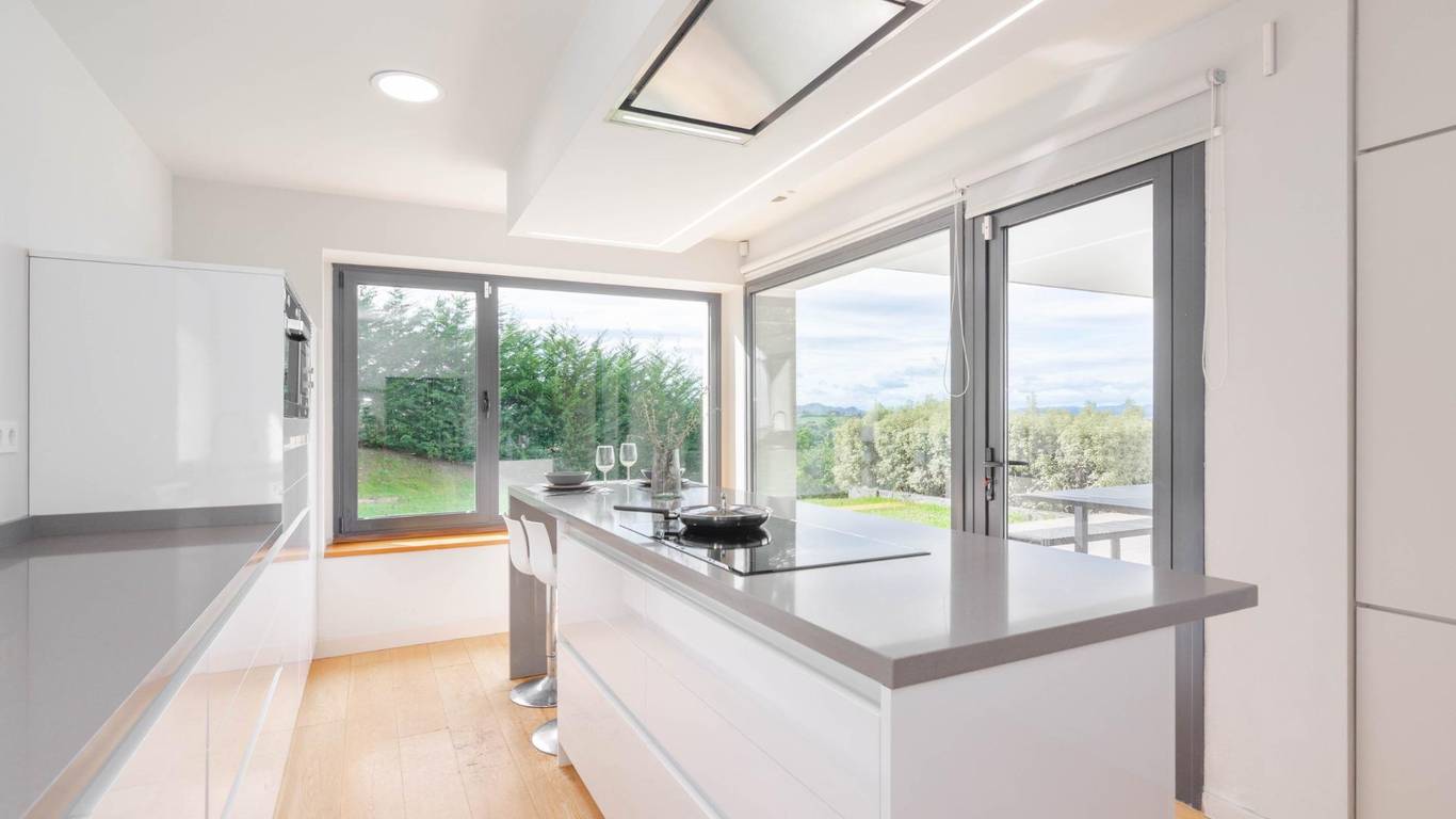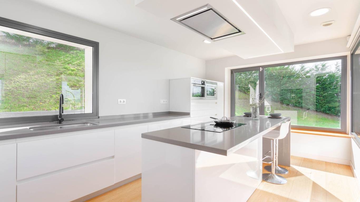 Cocina de diseño con isla central, perfectamente integrada en la zona de día.