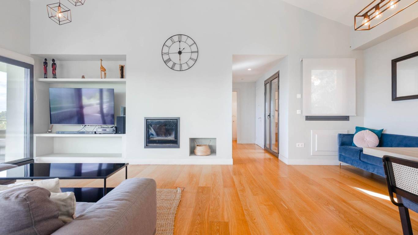 Elegante salón secundario con chimenea, con salida directa a la terraza mediante una gran ventana osciloparalela.