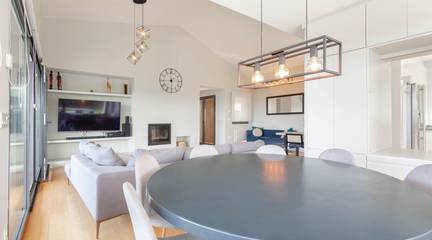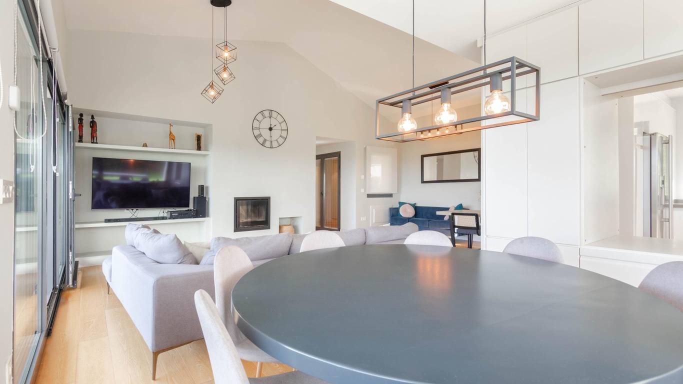 Amplio salón-comedor con chimenea y salida directa a la terraza perimetral acristalada, que enmarca unas vistas impresionantes a la ciudad de Gijón.