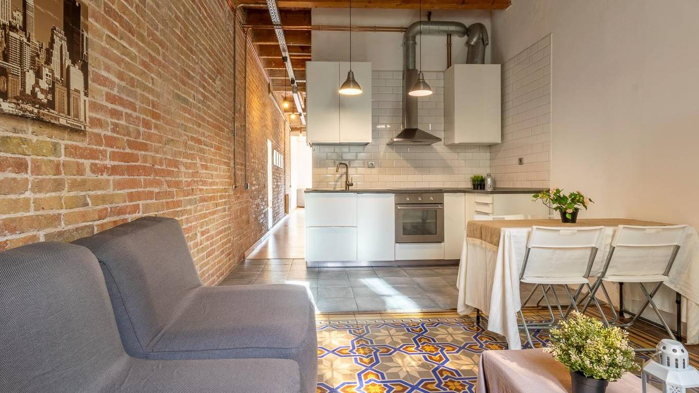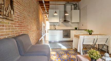 Desde el primer paso, su estilo te envuelve: suelos hidráulicos combinados con parquet, paredes de ladrillo visto y techos altos con vigas de madera y conductos a la vista que aportan un aire industrial elegante y cálido a la vez. Cada rincón refleja una cuidada armonía entre el encanto original y el confort actual.