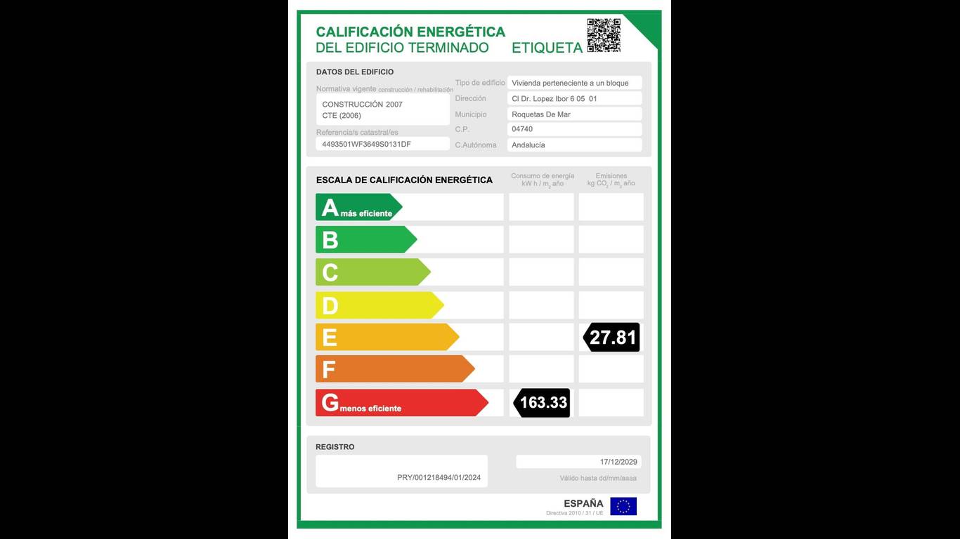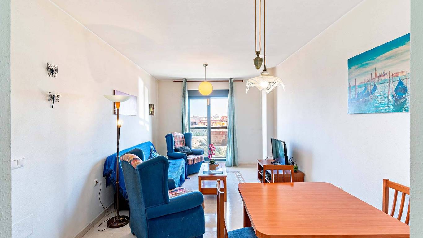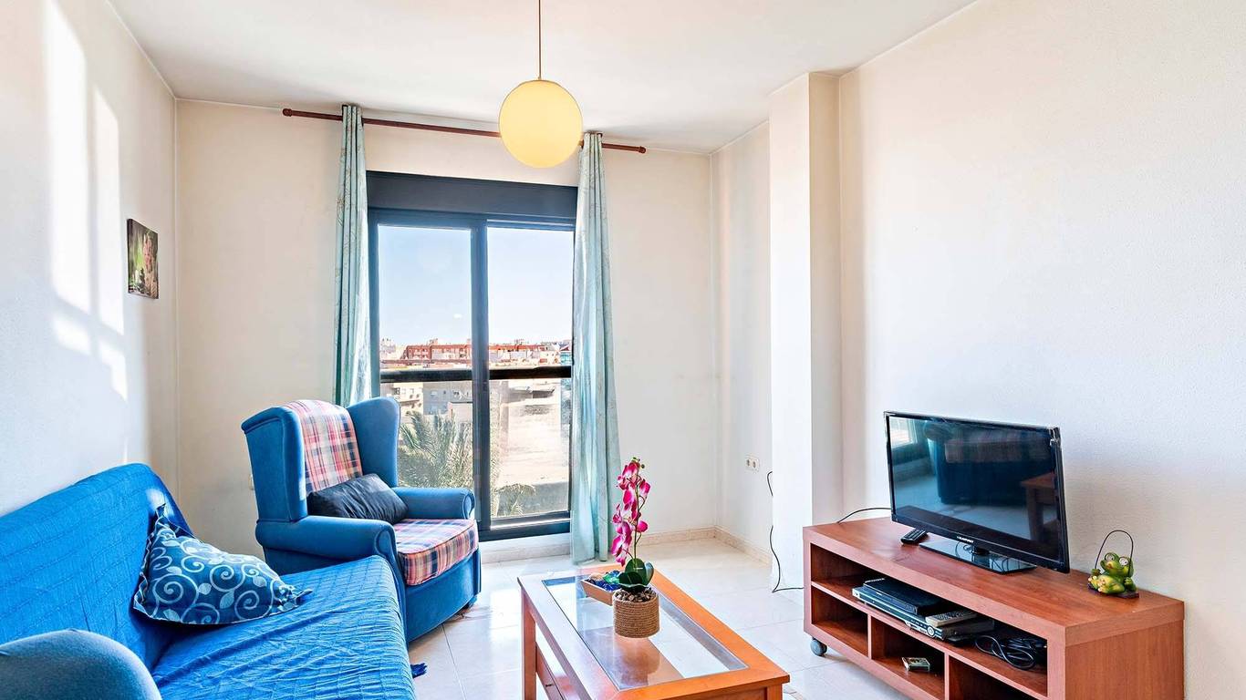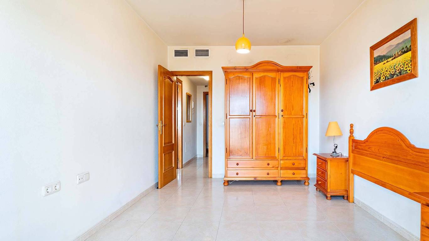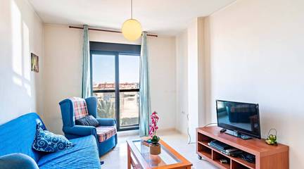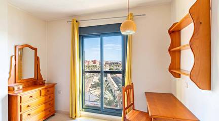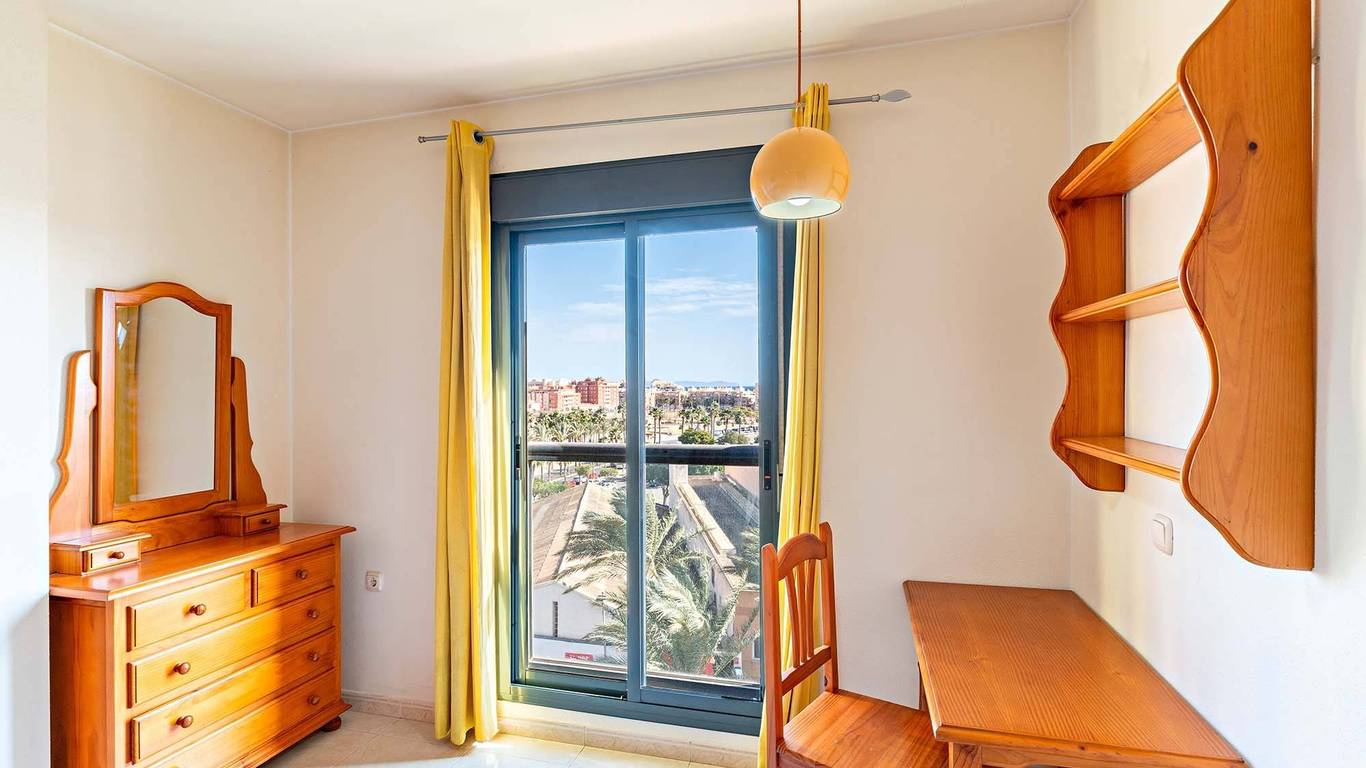 Un gran dormitorio, salón comedor, cocina amueblada con electrodomésticos y baño completo con cochera en el mismo residencial y de fácil acceso. A pesar de ser un piso de un dormitorio, tiene más metros útiles que algunos de dos dormitorios. Dos ventanales hasta el suelo le dan una luminosidad y unas vistas al mar y al Cabo de Gata envidiables.