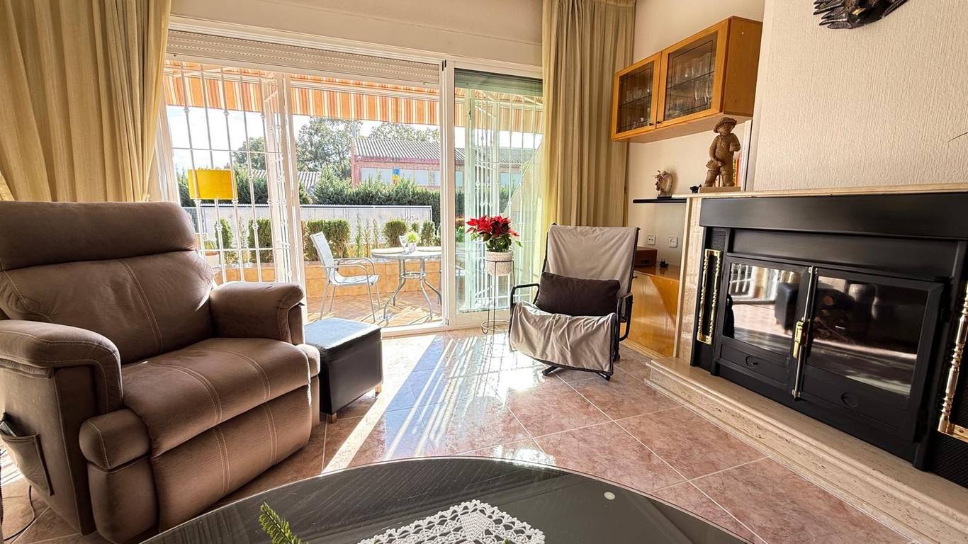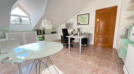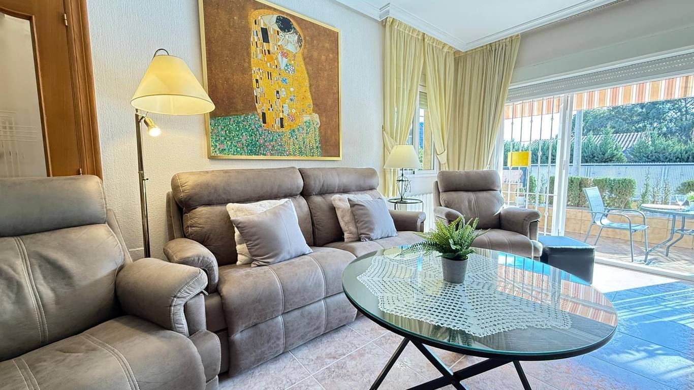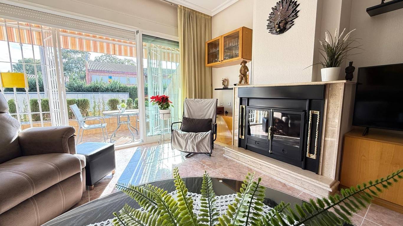 En la planta principal nos encontramos con un salón-comedor presidido por una acogedora chimenea, que se convierte en el verdadero corazón del hogar. Desde aquí se accede directamente a la terraza y al jardín, creando un ambiente ideal para reuniones, momentos de descanso o celebraciones al aire libre. La cocina, independiente y funcional, cuenta con salida a un agradable patio con leñero que aporta luz natural, además de zona de lavadero-despensa. En esta misma planta se ubican tres dormitorios y dos baños, uno de ellos integrado en el dormitorio principal. La clara diferenciación entre la zona de día y la zona de noche hace de esta vivienda un hogar muy cómodo y funcional.