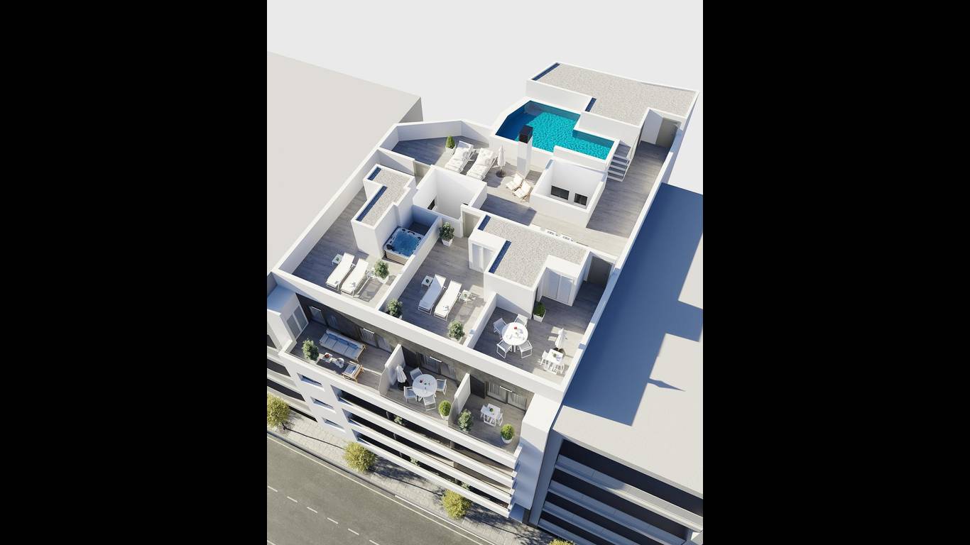 Apartment with terrace provided with 2 Bedrooms and 2 Bathrooms, communal swimming pool and optional underground parking & storage room.