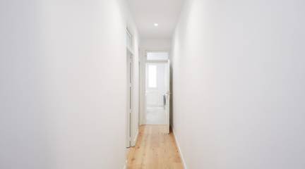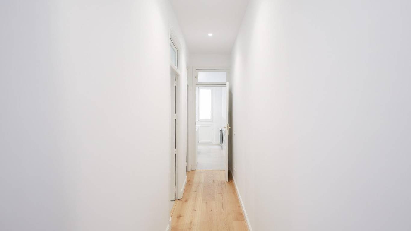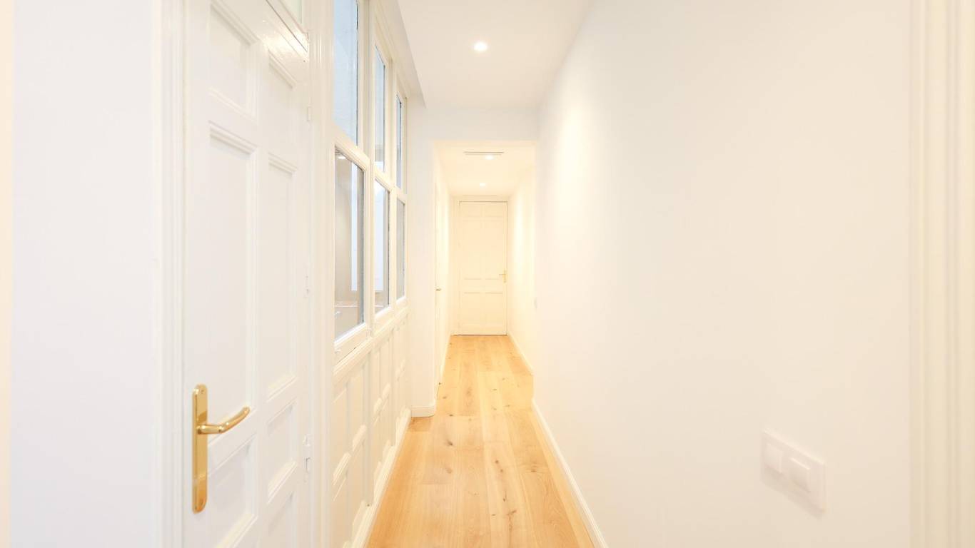 La distribución, amplia y lógica, sitúa un pasillo distribuidor generoso que articula las estancias interiores, incluyendo dos dormitorios interiores adicionales que pueden funcionar como espacios de trabajo, despacho o dormitorios secundarios adaptados a las necesidades de cada inquilino.