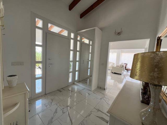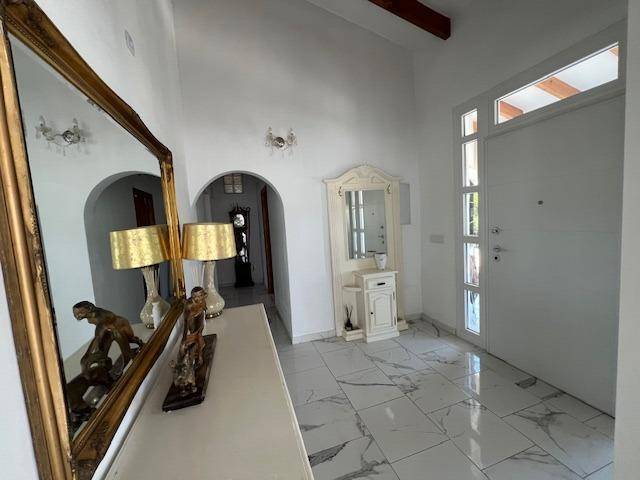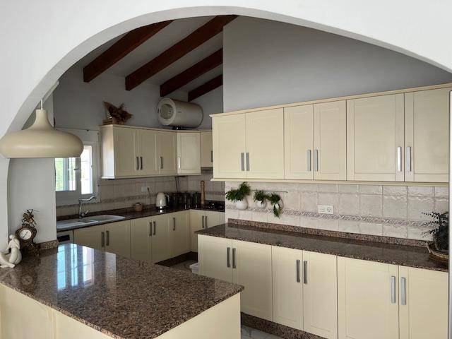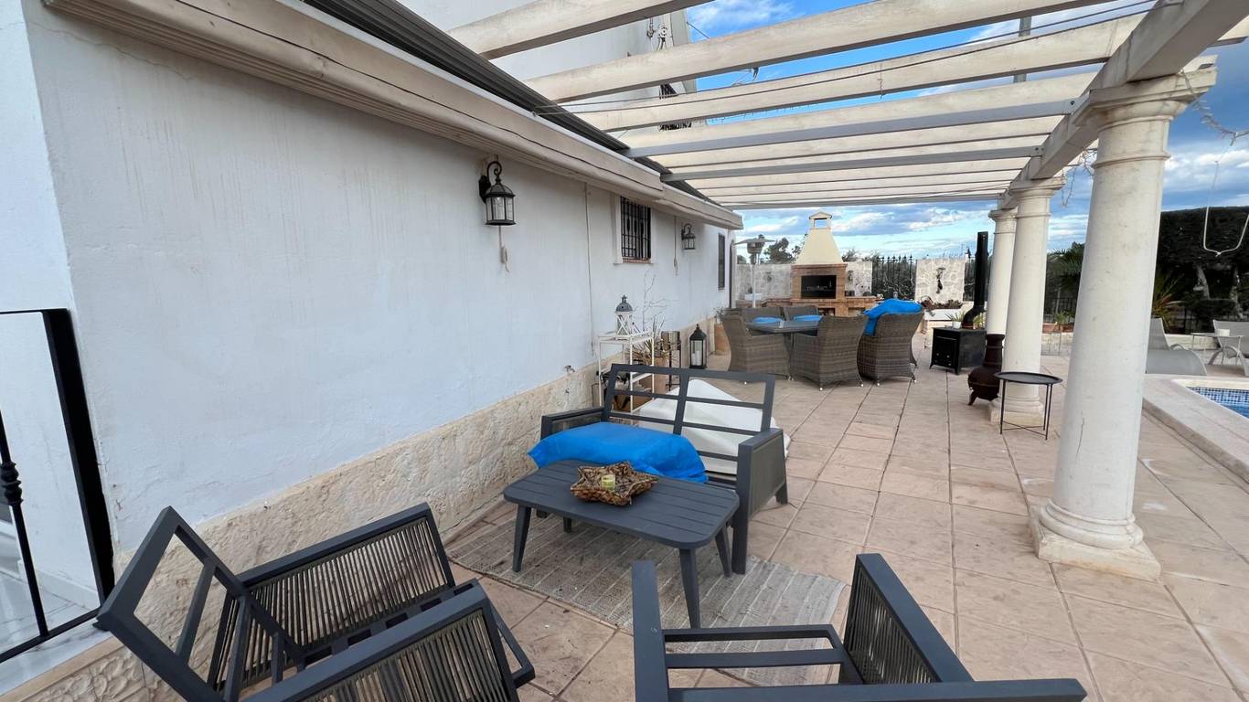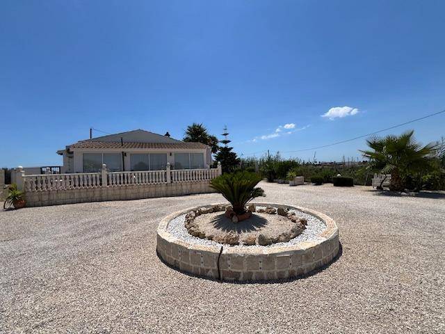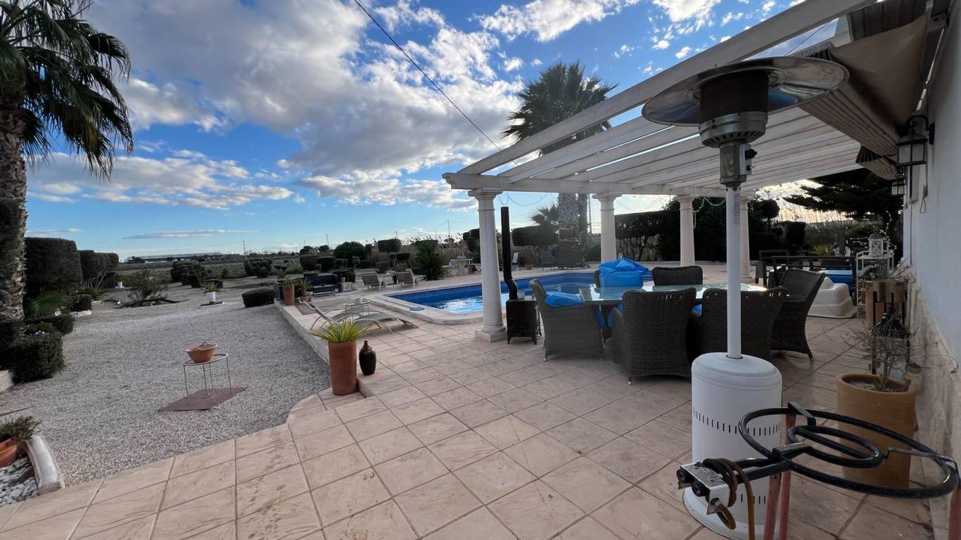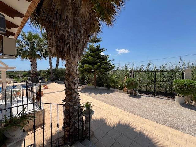 Discover the perfect blend of rural charm and modern living in this impressive detached property located in the countryside of Dolores. The property benefits from a secluded, gated location, including a luxurious private swimming pool and outdoor barbeque area. Five beautiful marble steps lead to the impressive entrance, with a high security front door. Once inside there is a welcoming hall with security lighting and a fitted mirror fronted wardrobe, providing excellent storage. There are 3 generously sized bedrooms: Two double and one mezzanine style single. All bedrooms have ample wardrobe and storage space. Additionally each boasts its own unique and beautifully styled and furnished en suite bathroom. There is an additional fourth family shower room for further comfort. The wonderfully spacious open plan living area has a spectacular lounge and dining area, with outstanding natural lighting and views to the stunning gardens and surrounding countryside. There is a wood burning stove for the winter months. The kitchen is fully equipped with a range of base and wall units and marble surfaces. The island integrates an electric oven and there is a gas and electric hob. A large American style fridge freezer and washing machine complement the space. The exterior of the property is just as impressive with its large and charming mature gardens of palm and olive trees in addition to tastefully placed floral bushes to enhance the privacy. There is a large terraced area leading from the lounge dining area and 2 further balconies. Once outdoors the spacious outdoor dining patio complements the barbecue area, with a further tiled courtyard. The property has air conditioning heating units in the living area and bedrooms.