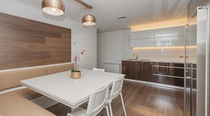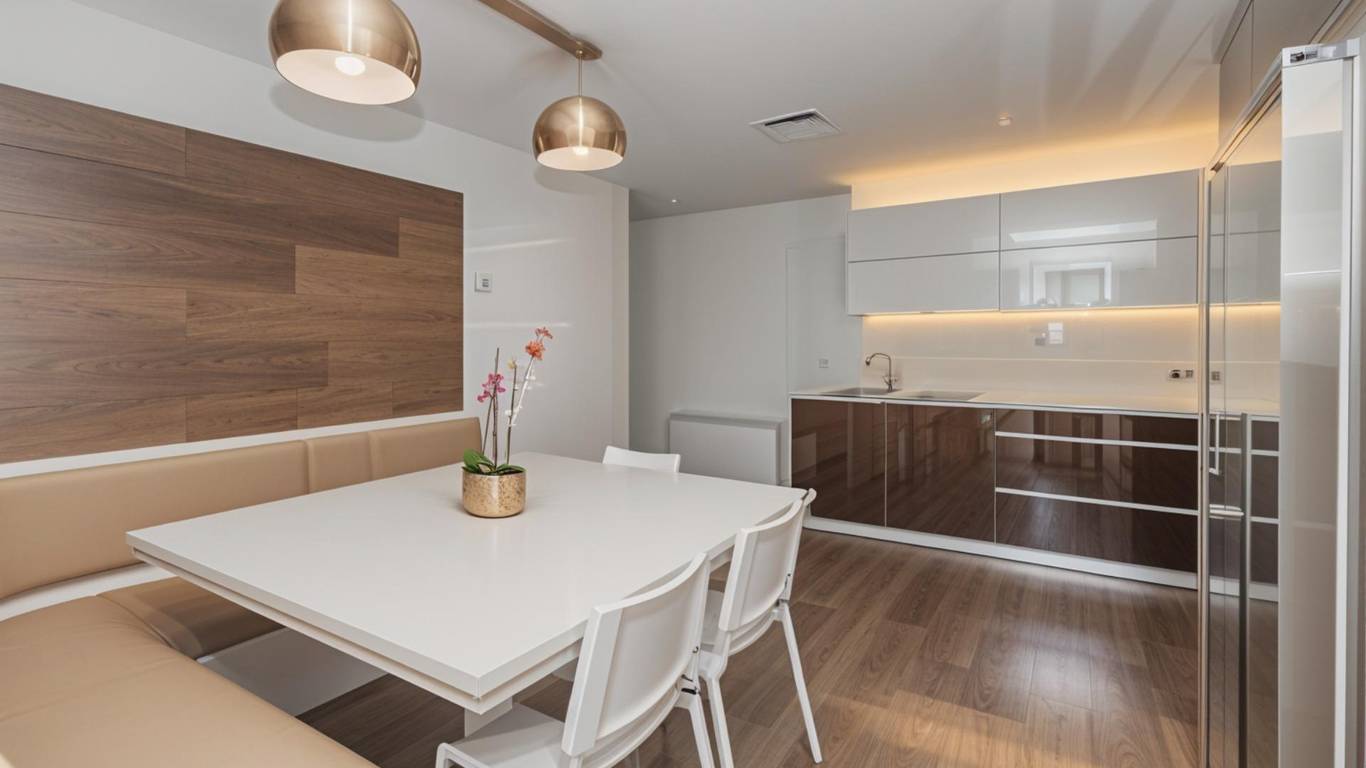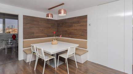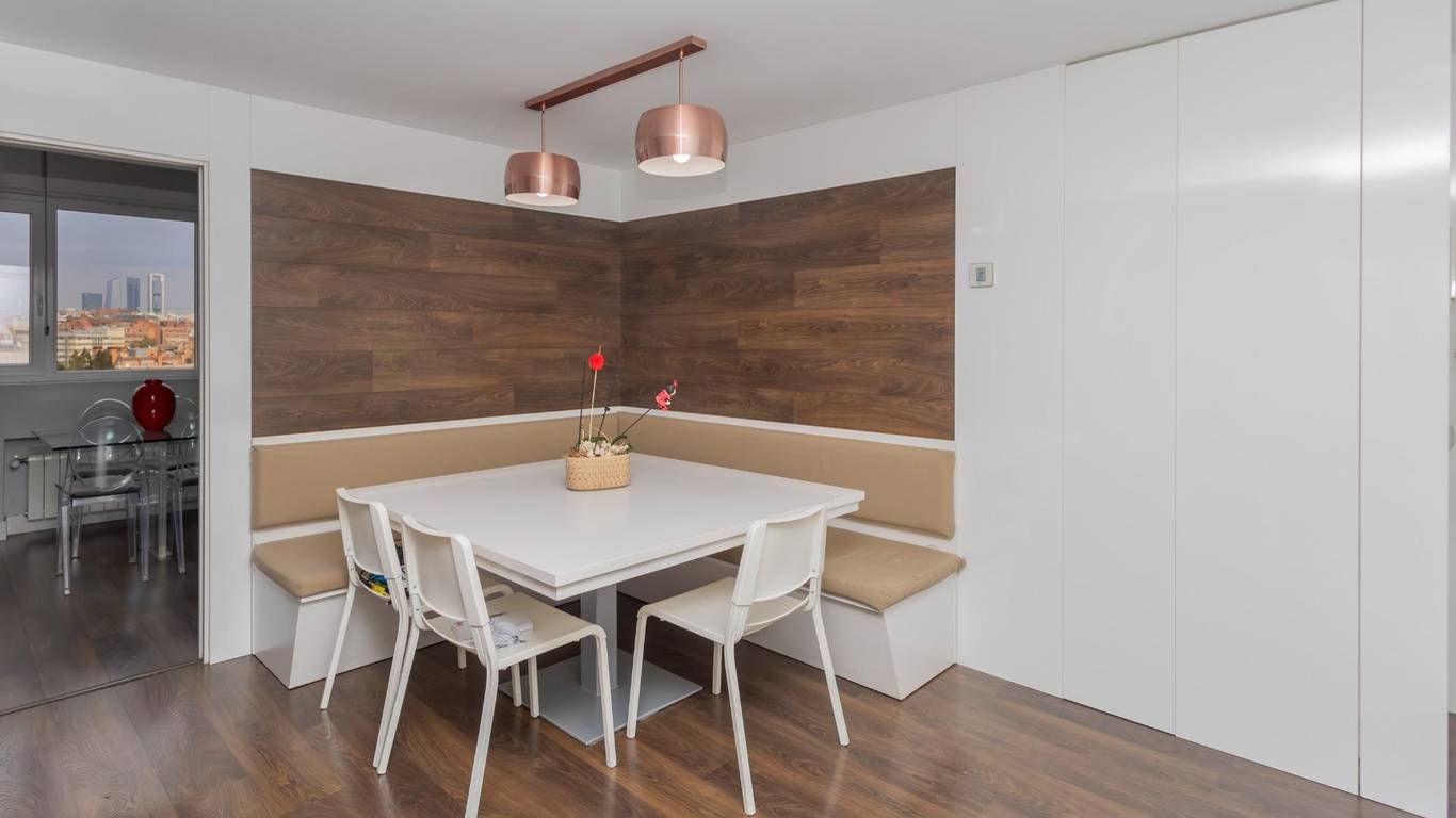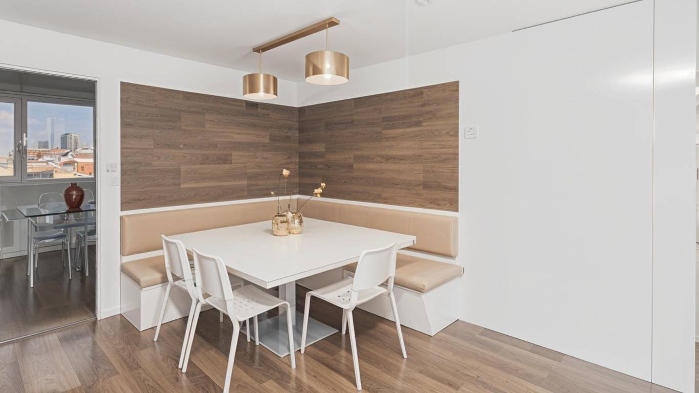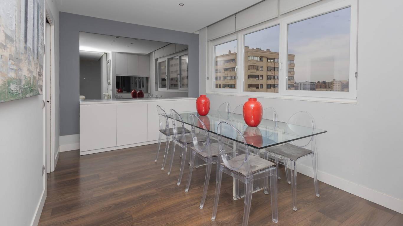 La luminosidad, junto con el suelo de tarima, aporta una agradable calidez y continuidad visual. El comedor, separado del salón, invita a reuniones familiares y cenas tranquilas, manteniendo la independencia y el confort de cada ambiente.
