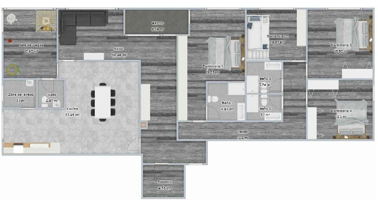 La zona de descanso está compuesta por cinco dormitorios de excelente tamaño, versátiles y adaptables a cualquier necesidad. La vivienda se completa con tres baños completos y un aseo, bien distribuidos para dar servicio con comodidad a toda la casa.