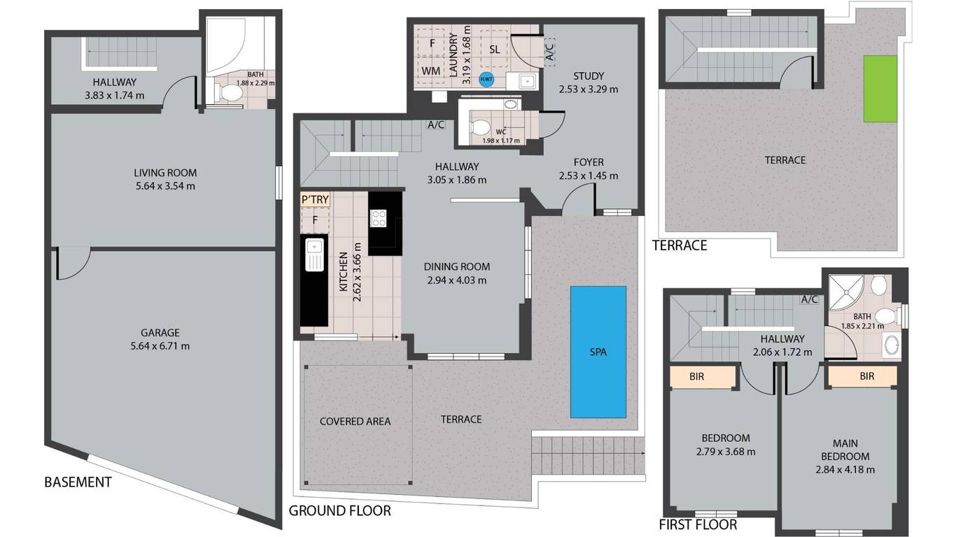 Includes garage, room with bathroom, living room-kitchen, terrace, guest toilet, office, storage room, two bedrooms, bathroom and rooftop terrace.