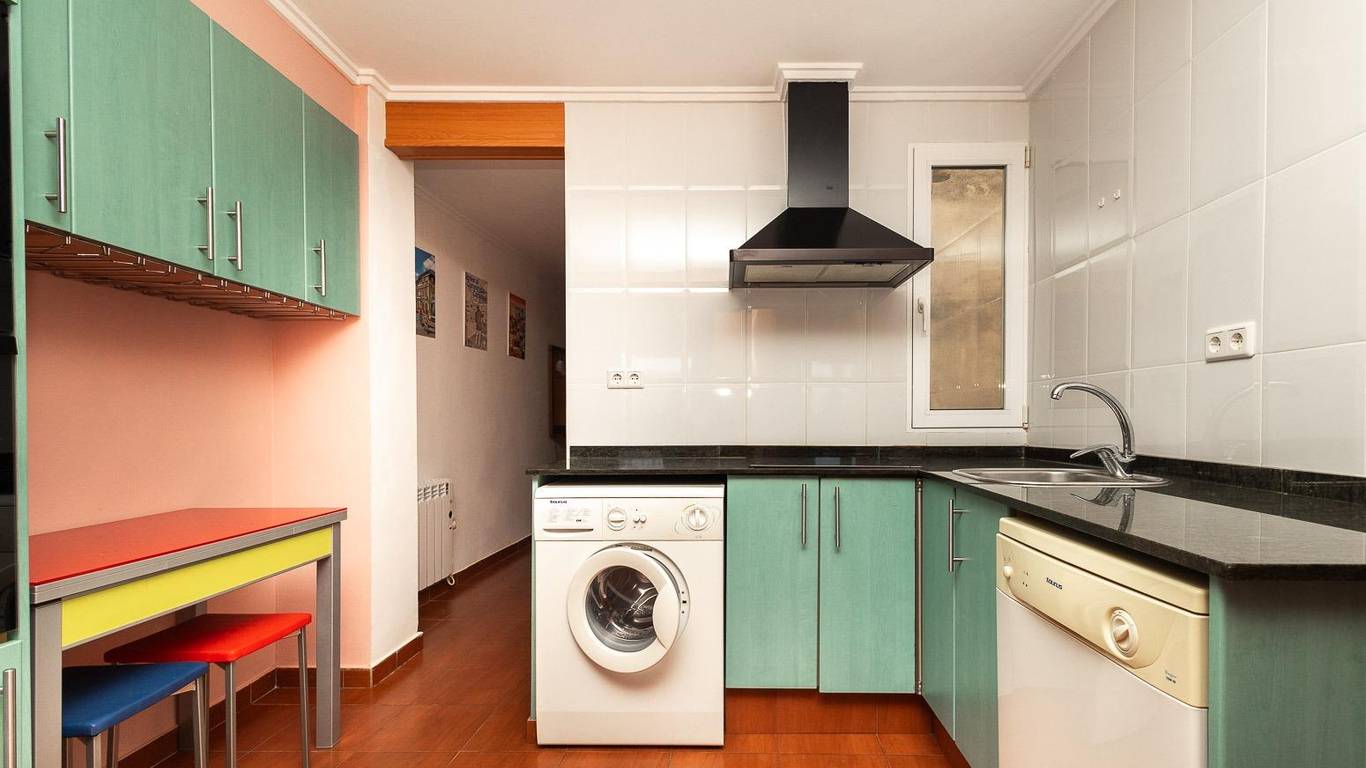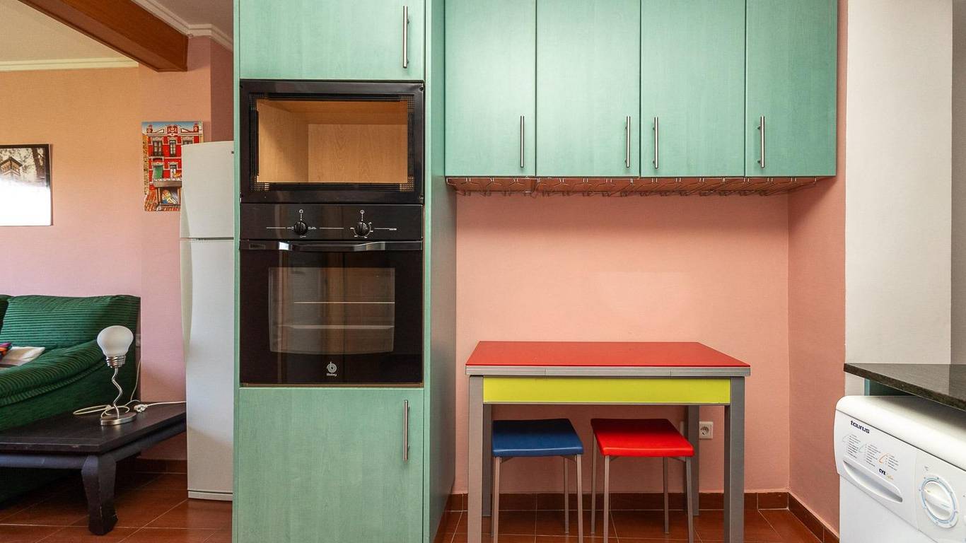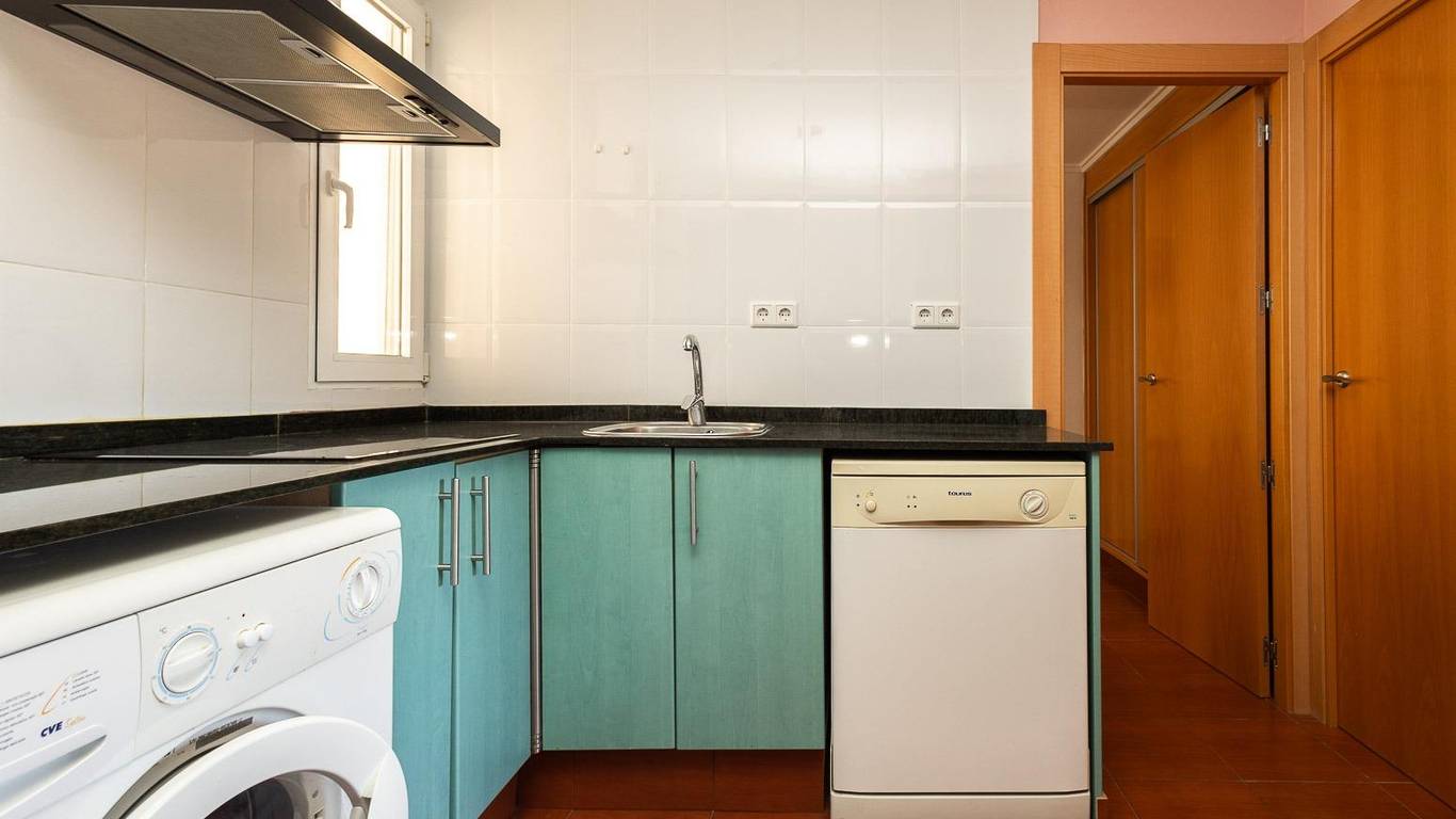 The property is laid out with three bedrooms, one of them double, all fitted with built-in wardrobes. It also offers one full bathroom and a bright open-plan living and dining area with a fully equipped kitchen. A washing machine and dishwasher are included.