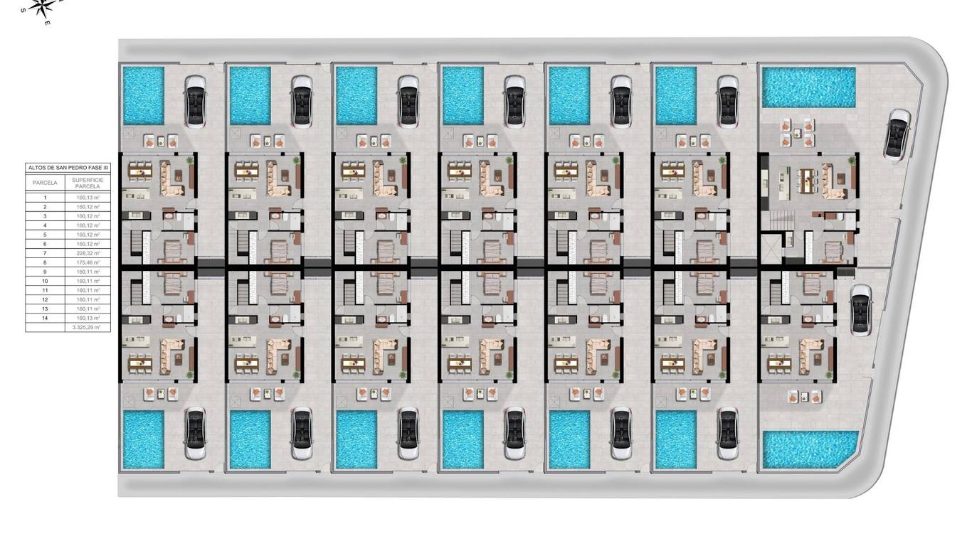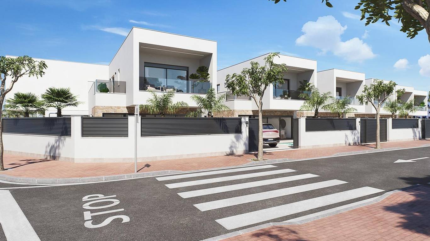 Modern New Build Villas with Private Pool in San Pedro del PinatarContemporary Design and Premium Quality LivingDiscover the third phase of this exclusive residential project in San Pedro del Pinatar, where modern architecture meets comfort and functionality. These 14 semi detached villas are designed with a minimalist style and high quality finishes, offering an elegant and sophisticated living experience on the Costa Calida. Each villa features 3-4 spacious bedrooms, 3 bathrooms, private swimming pool, terraces and a private garden, creating the perfect environment for privacy, relaxation and Mediterranean outdoor living.San Pedro del Pinatar is one of the most sought after towns in the Mar Menor area, known for its natural salt lakes, calm beaches and year round pleasant climate, making it ideal for both permanent living and holiday use.Open Plan Layout Designed for Modern LifeThe villas are carefully distributed with an open plan kitchen connected to a bright living and dining area. Large windows in the living room with motorized blinds provide direct access to the pool area and allow natural light to flood the interior spaces.Key features of each property include:3 bedrooms with built in wardrobes3 fully equipped bathrooms with vanity units, mirrors and shower screensFurnished kitchen with Balay appliances includedPrivate pool and garden areaInterior and exterior LED lightingTerraces on the first floor and optional rooftop solariumOn plot parking spaceAerothermal system for hot waterPhotovoltaic solar panels for improved energy efficiencyPre installation of ducted air conditioningThese homes are designed to combine sustainability, comfort and modern style in every detail.Prime Location Near Beaches and ServicesLocated between the Mar Menor and the Mediterranean Sea, San Pedro del Pinatar is a paradise for beach lovers and water sports enthusiasts. The town offers a lively marina, natural mud baths, shops, restaurants, sports facilities and excellent services all year round.Beaches of the Mar Menor 3 kmMediterranean beaches 5 kmDos Mares Shopping Center 5 kmLo Romero Golf 10 kmRoda Golf 15 kmMurcia Corvera Airport 30 kmAlicante Airport 80 kmSan Pedro Marina 4 kmAn Ideal Home for Lifestyle and InvestmentThanks to their location, design and energy efficient features, these villas represent an excellent opportunity as a permanent residence, holiday home or rental investment in one of the most attractive areas of the Costa Calida.Contact us today for more information or to arrange a viewing and secure your new villa in San Pedro del Pinatar.