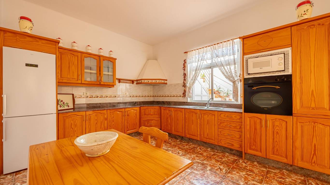 La cocina independiente, amueblada y equipada, conecta con un patio semi-cubierto, perfecto como zona de almacenaje o espacio auxiliar.