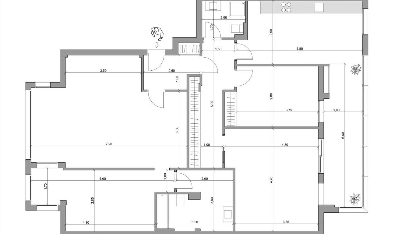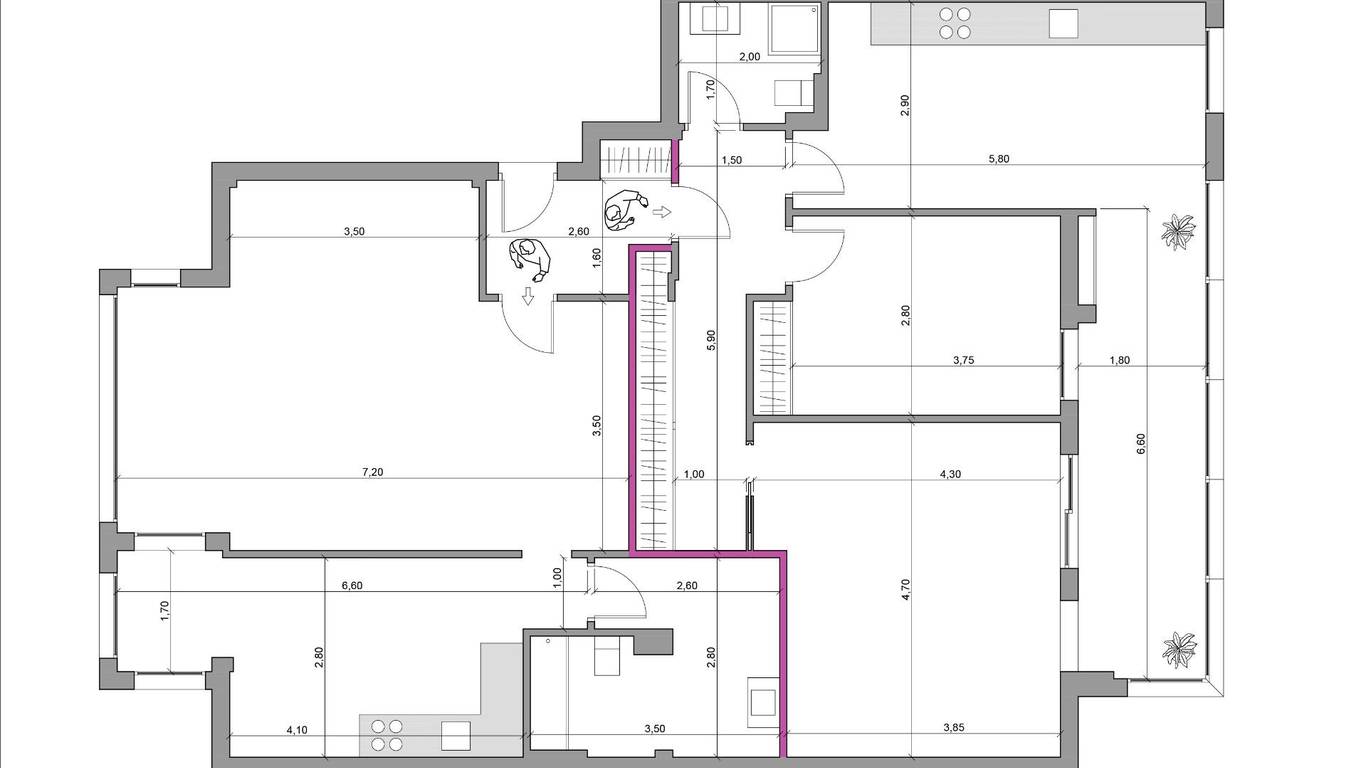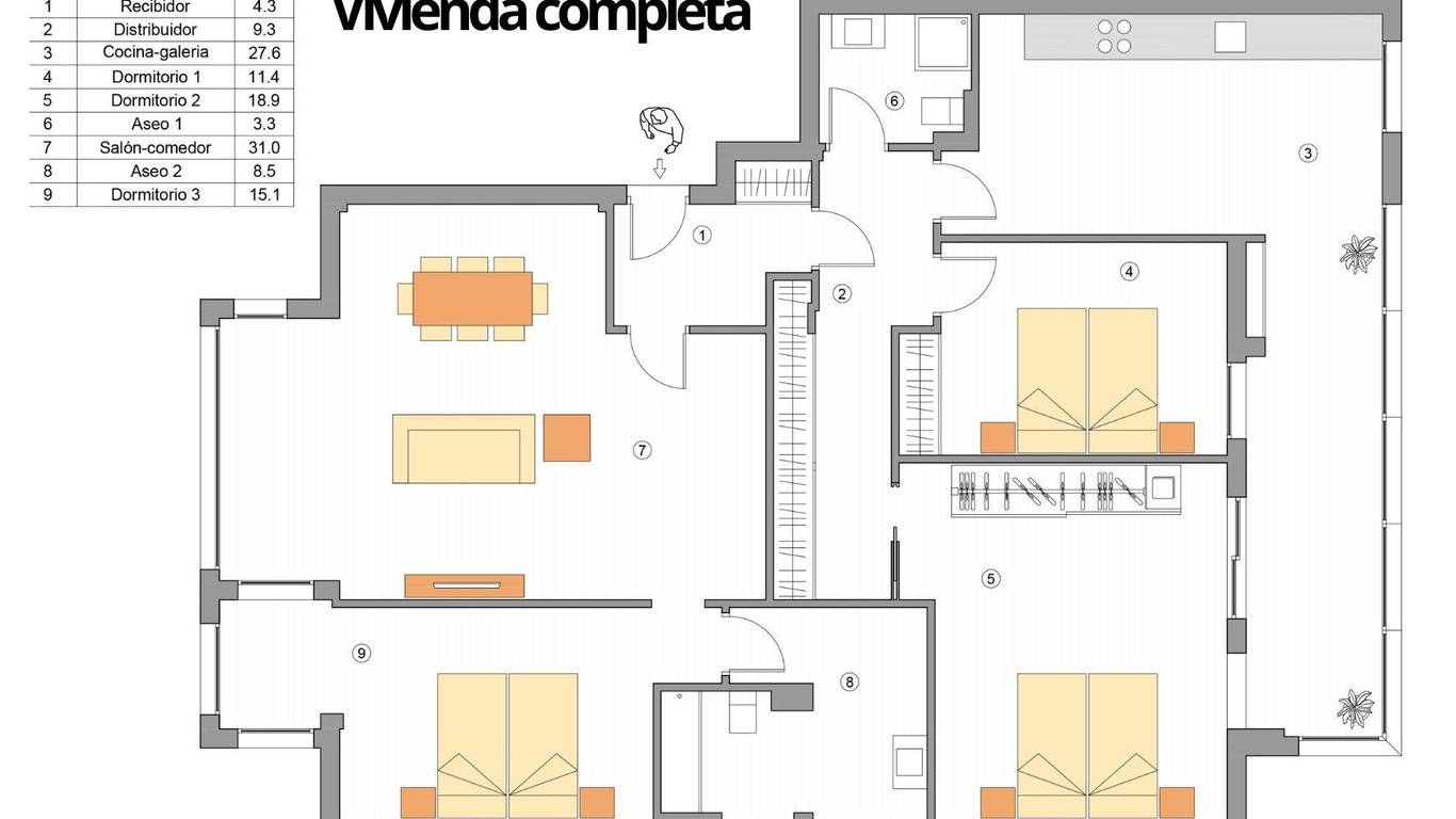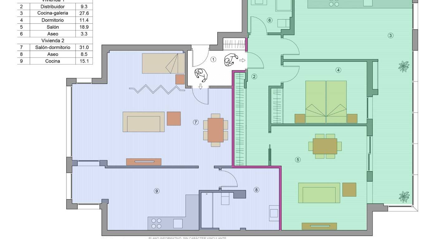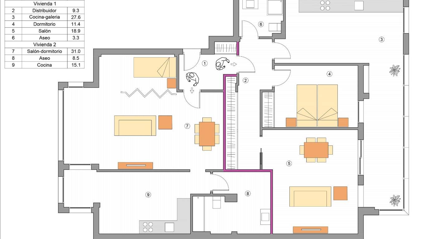 En esta redistribución, la actual cocina del loft podría transformarse en un dormitorio principal con baño en suite, mientras que el resto del espacio unido permitiría disponer de tres dormitorios adicionales, un segundo baño completo y la terraza acristalada, creando una vivienda amplia, cómoda y luminosa.