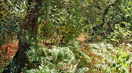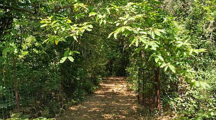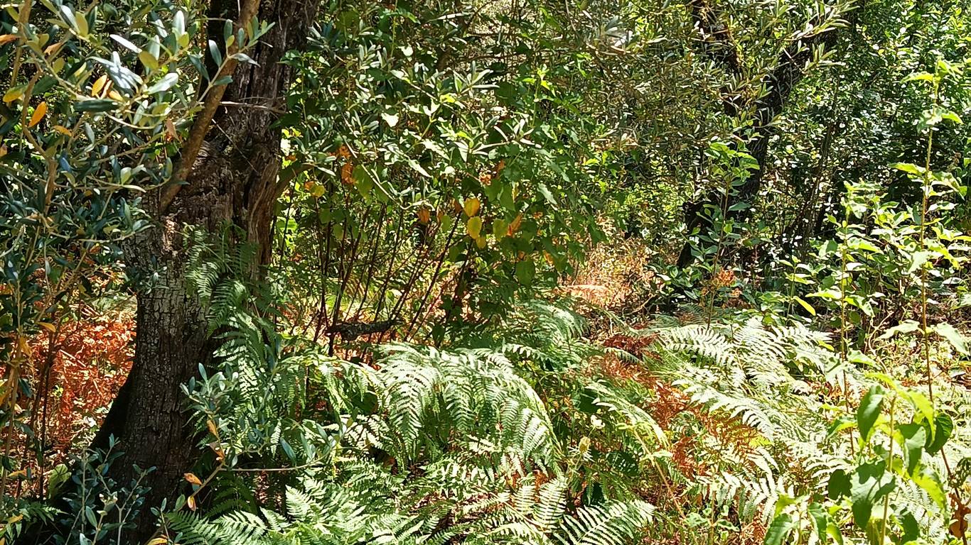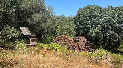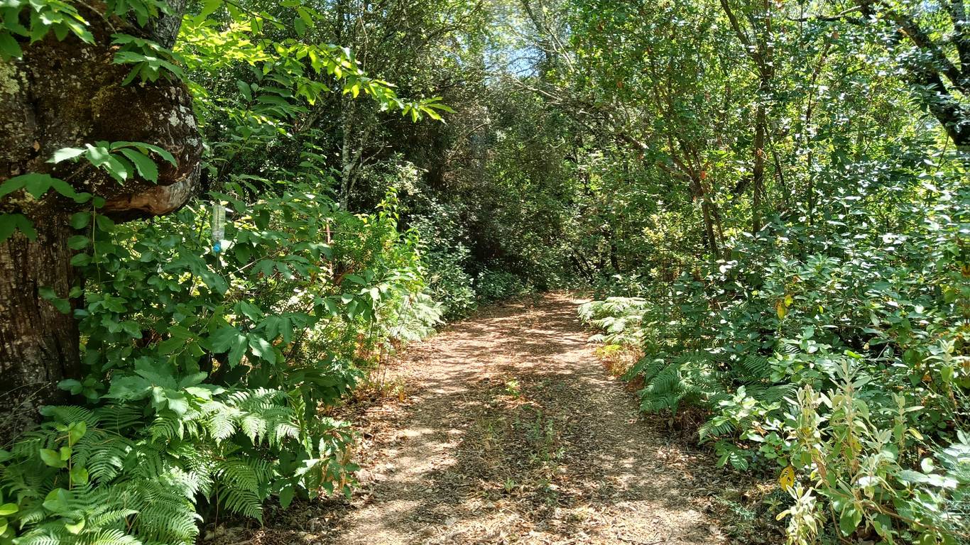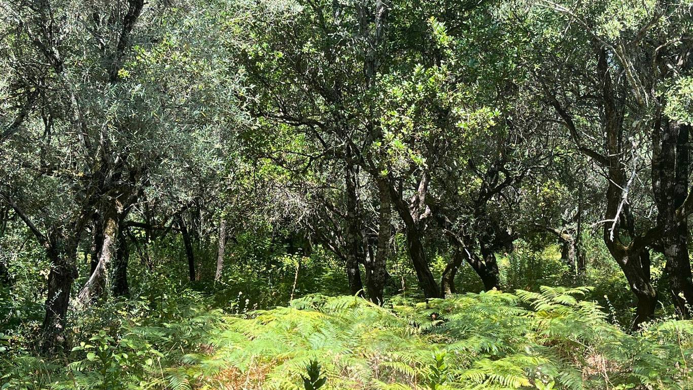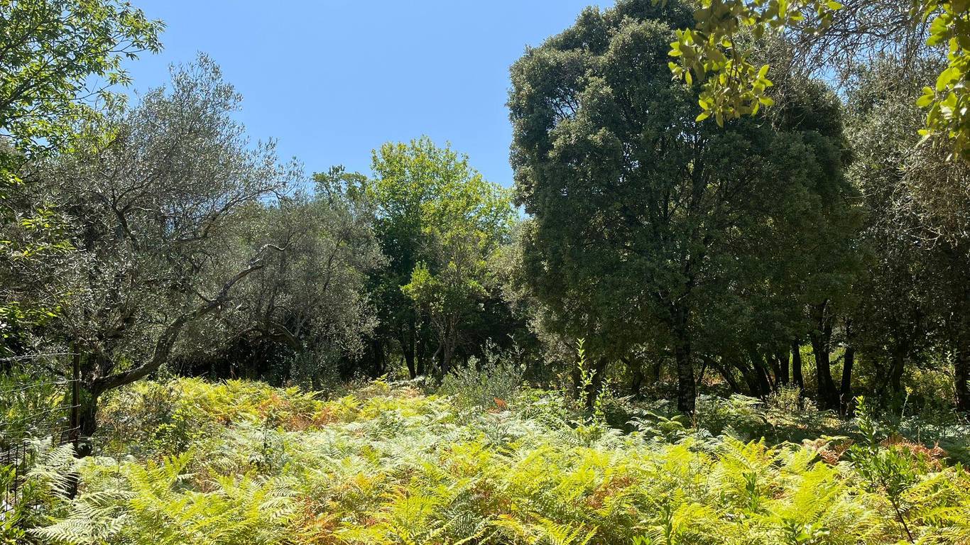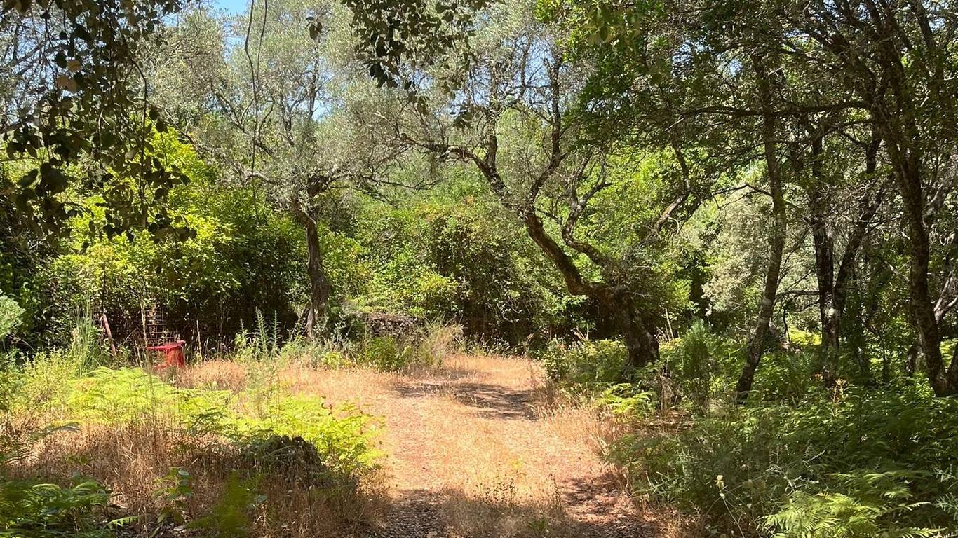 La finca ofrece una mezcla única de paisajes: sombra natural de castaños, encinas y alcornoques, senderos, fauna autóctona y un microclima ideal para huertos ecológicos.