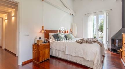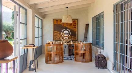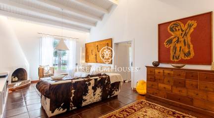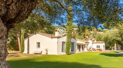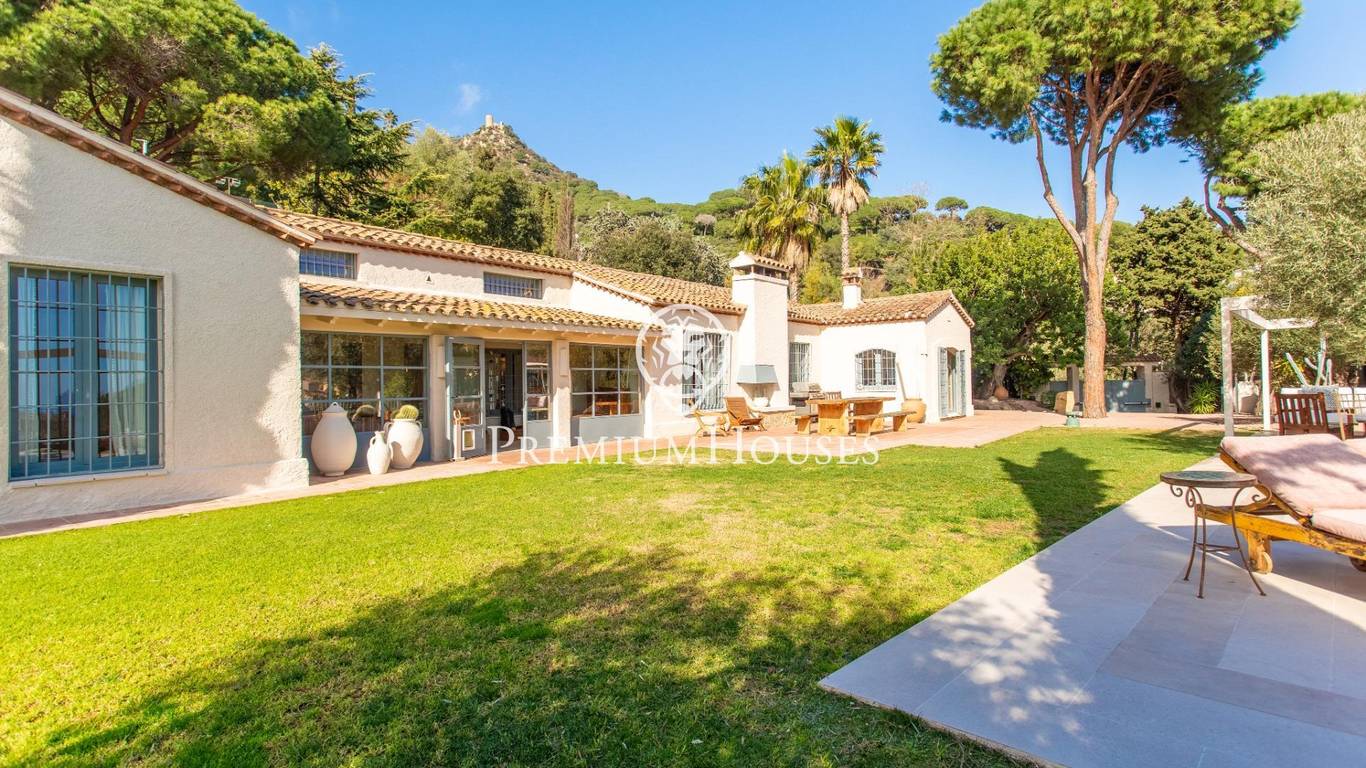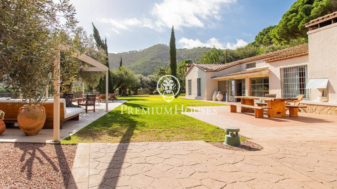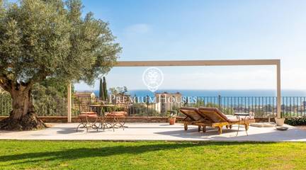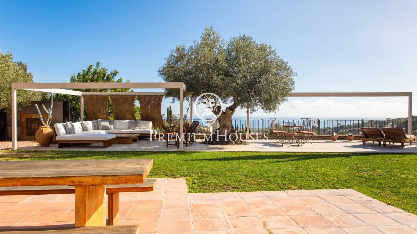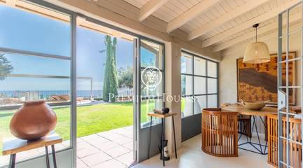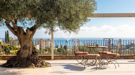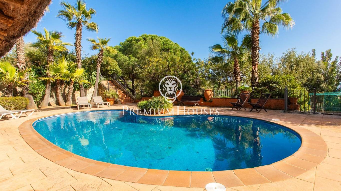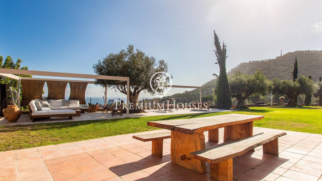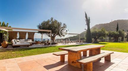 Located in one of the most prestigious residential areas of Cabrera de Mar, along the sought-after coastline of the Maresme, this exceptional villa offers a perfect balance of privacy, comfort and natural surroundings. Set on an impressive 5,400 m landscaped plot, the property enjoys breathtaking panoramic views of the sea, the mountains and the city skyline, creating a truly privileged living environment throughout the year.One of its most distinctive features is the convenient single-level layout, providing both practicality and refined elegance. The main residence is characterized by generous, light-filled interiors, including a sophisticated living room with fireplace and enclosed gallery area, a formal dining room ideal for entertaining, and a fully equipped kitchen with a welcoming breakfast area for everyday living.The night area has been thoughtfully designed to ensure maximum comfort. The spacious primary suite features its own fireplace, walk-in wardrobe and two full bathrooms, one of which includes a whirlpool bathtub. In addition, the property offers three double bedrooms, a medium-sized bedroom and a private office, ideal for remote work or study. Three further full bathrooms and a separate laundry room complete the interior layout.Outdoors, the beautifully maintained garden becomes one of the homes greatest highlights. It features a private swimming pool, gym, paddle tennis court and basketball court, as well as an elegant chill-out area surrounded by nature. The outdoor kitchen and barbecue area provide the perfect setting for hosting gatherings and enjoying al fresco dining in complete tranquility.Additional features such as air conditioning, alarm system, private garage and ample storage areas ensure comfort and security at all times. Its proximity to prestigious international schools and excellent transport connections makes this villa an outstanding choice for families seeking exclusivity without compromising accessibility.A unique residence designed to enjoy a distinguished lifestyle in an exceptional Mediterranean setting.