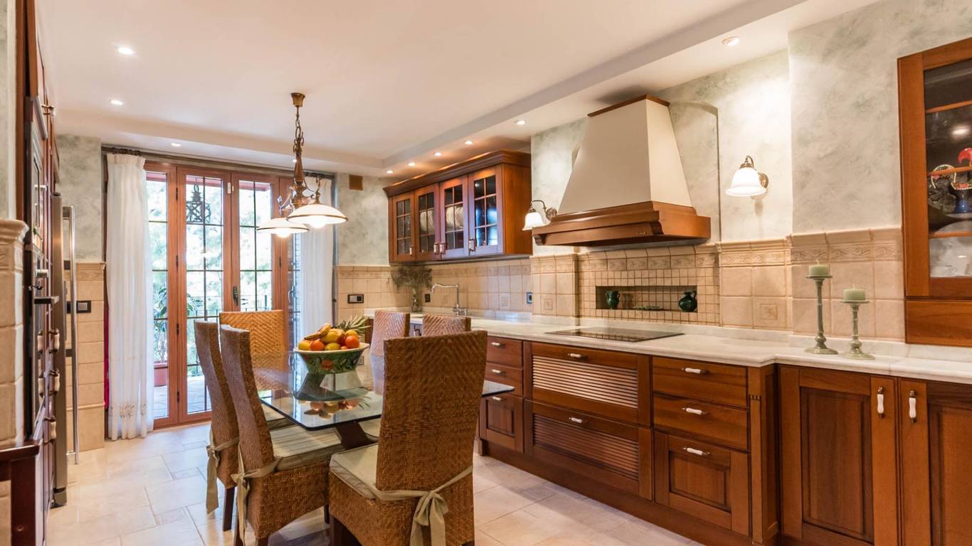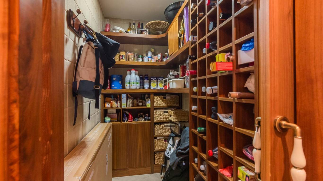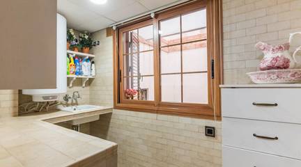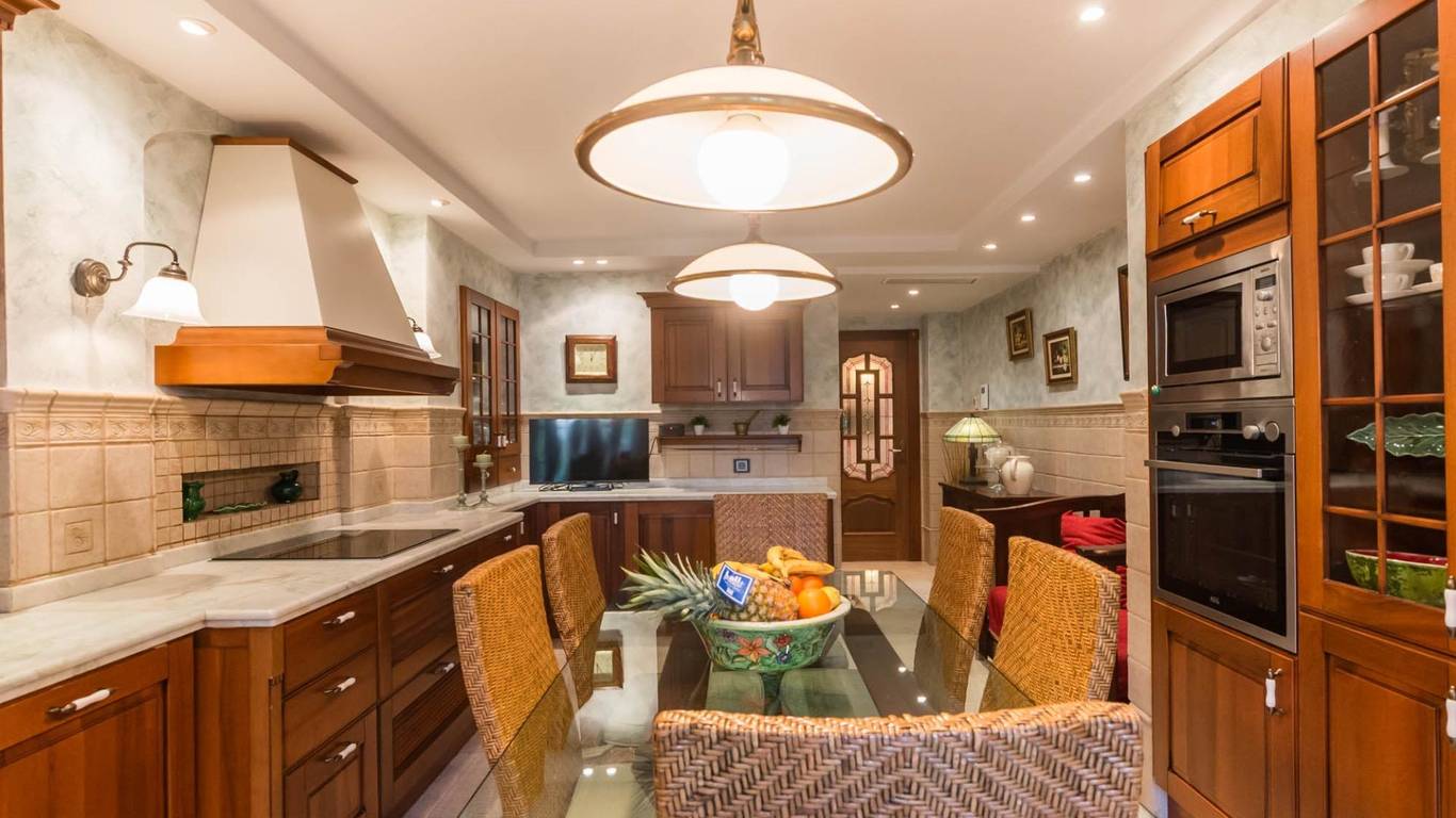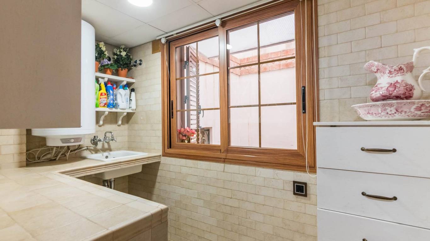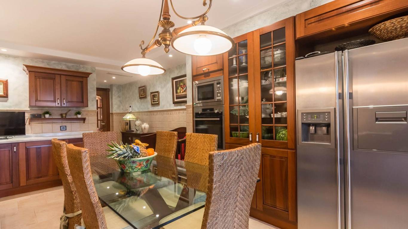 La cocina, con su mobiliario de madera de nogal y encimera de mármol italiano,cuidado al detalle y una cómoda mesa de comedor, también se abre a la terraza, creando un espacio cotidiano lleno de calidez y vida. Junto a la zona de dormitorios se ubica un cómodo lavadero con zona de planchado, independiente pero muy práctico en el día a día, que ayuda a mantener ordenadas las estancias principales.