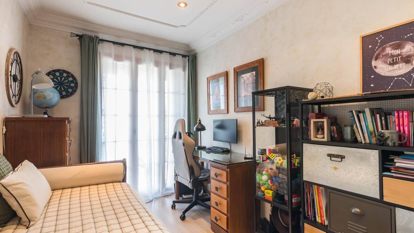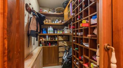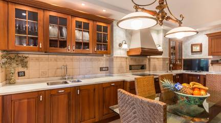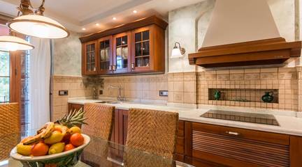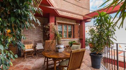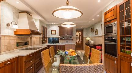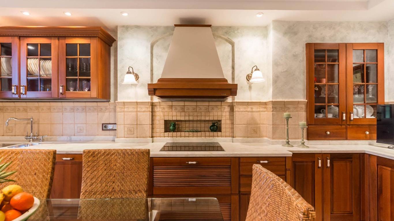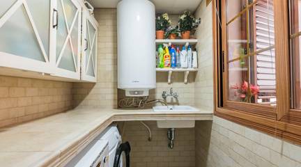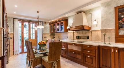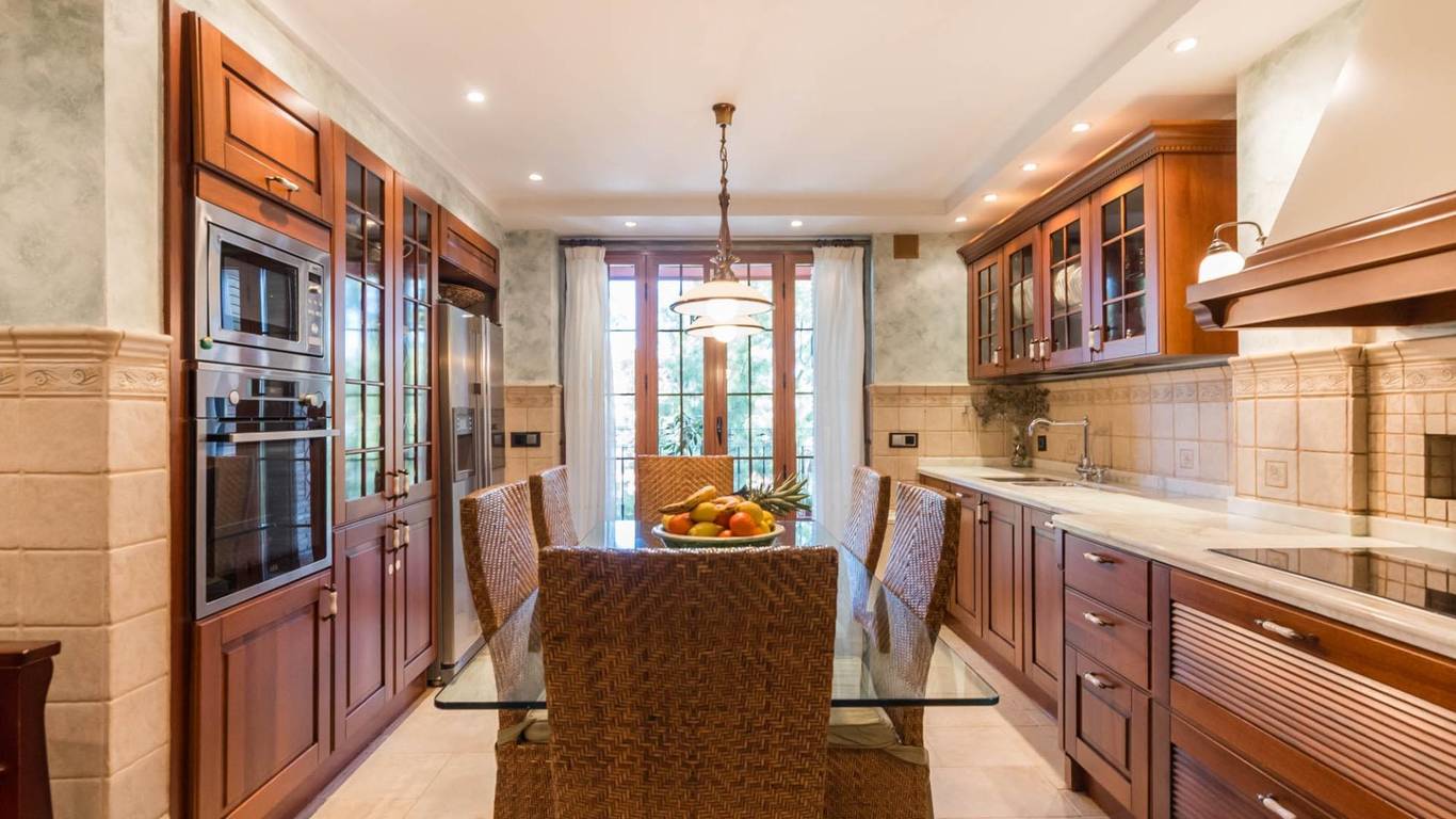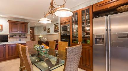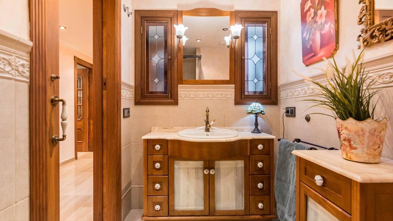 La cocina, con su mobiliario de madera de nogal y encimera de mármol italiano,cuidado al detalle y una cómoda mesa de comedor, también se abre a la terraza, creando un espacio cotidiano lleno de calidez y vida. Junto a la zona de dormitorios se ubica un cómodo lavadero con zona de planchado, independiente pero muy práctico en el día a día, que ayuda a mantener ordenadas las estancias principales.
