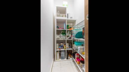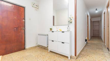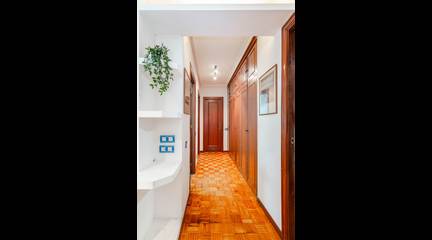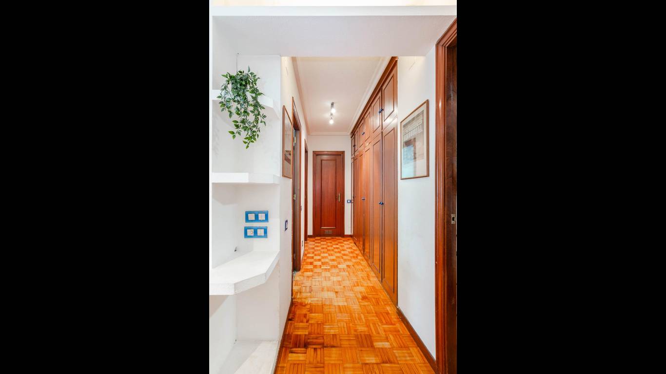 Armario empotrado en el pasillo con gran capacidad de almacenaje, suelos de parquet y gres.