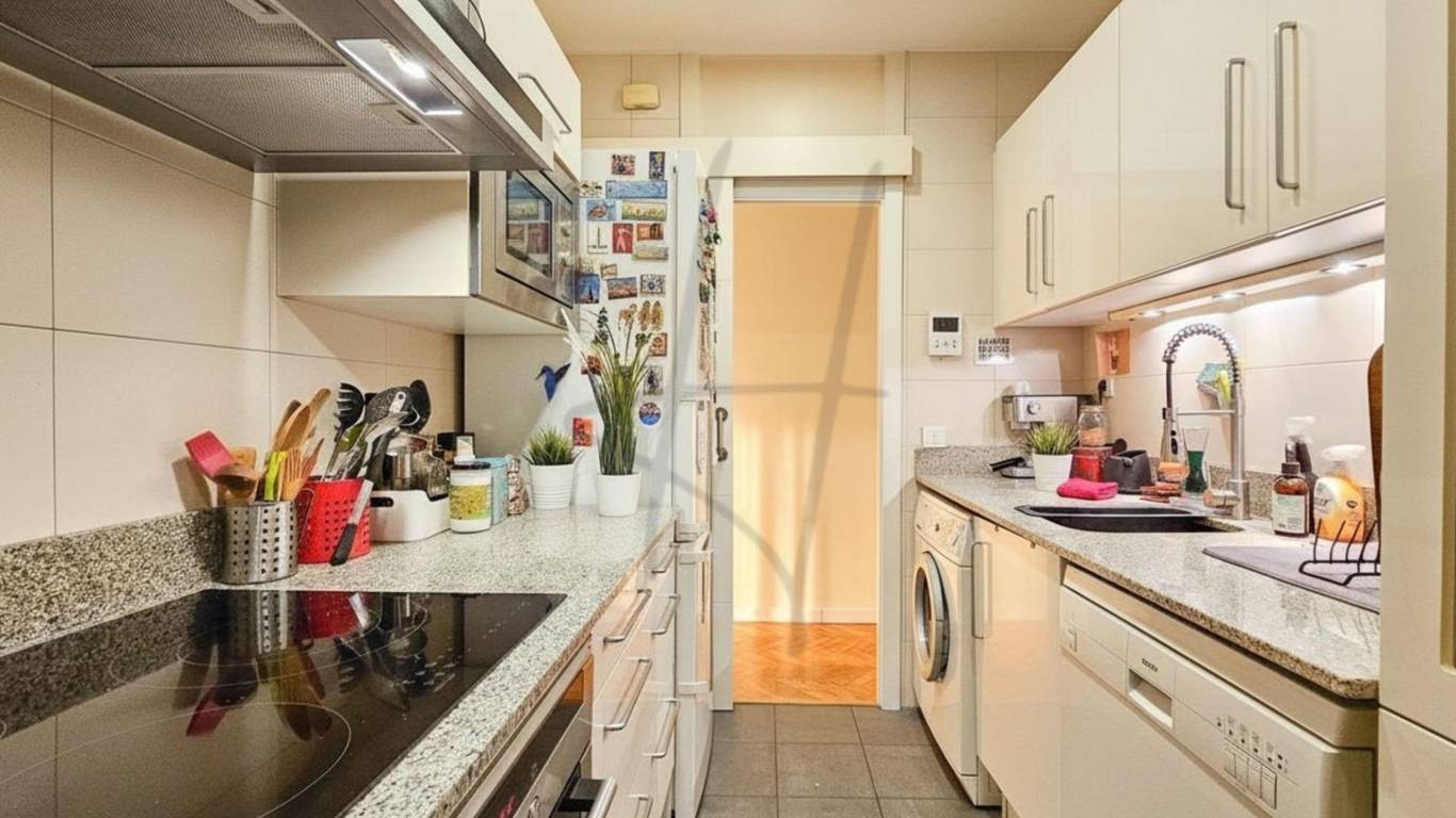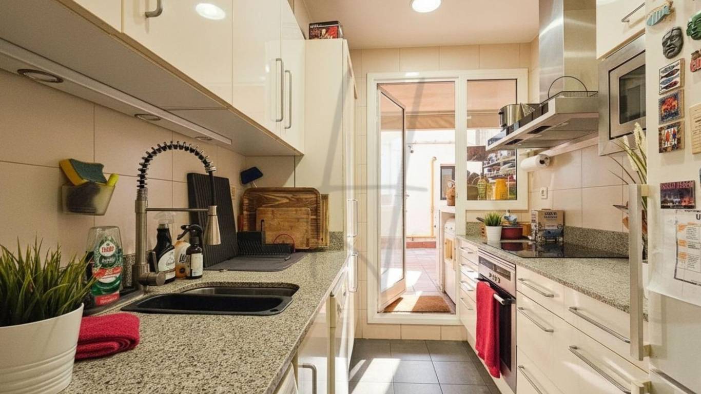 La cocina, cómoda y bien organizada, tiene salida a un gran patio interior , un espacio tranquilo y reservado, ideal como zona de lavandería, almacenaje o rincón de relax lejos del ruido.