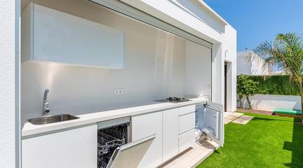 The properties comprise three double bedrooms (all with fitted wardrobes), two bathrooms (en-suite to the master bedroom) and a toilet, a fully equipped modern kitchen (with breakfast bar) and an open plan living/dining area, leading to the spacious tiled garden and private swimming pool.
