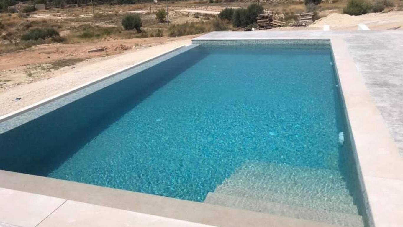 Private swimming pool 4x8 meters with a concrete press sunbathing terrace to connect the house with the pool.