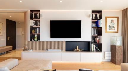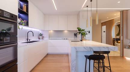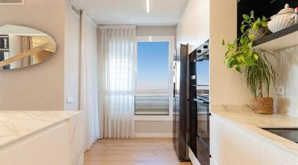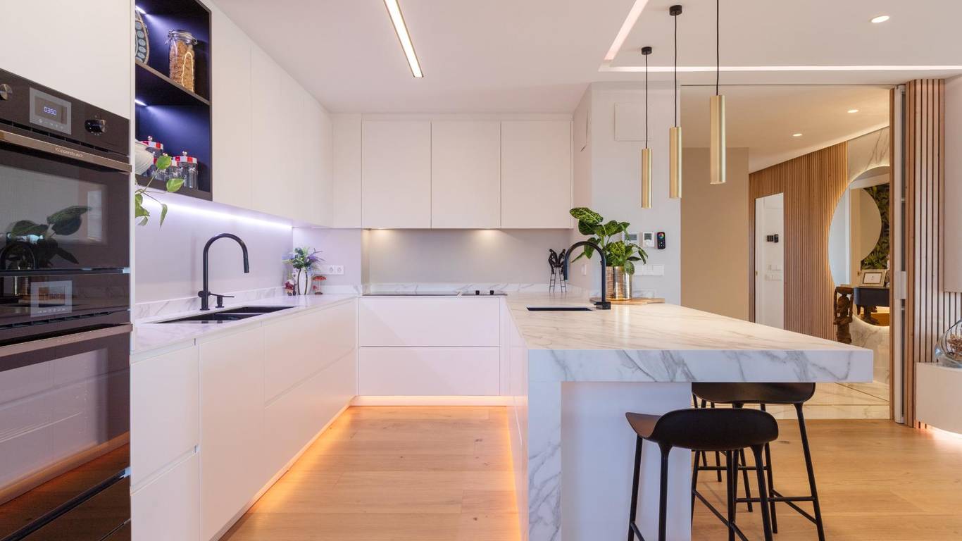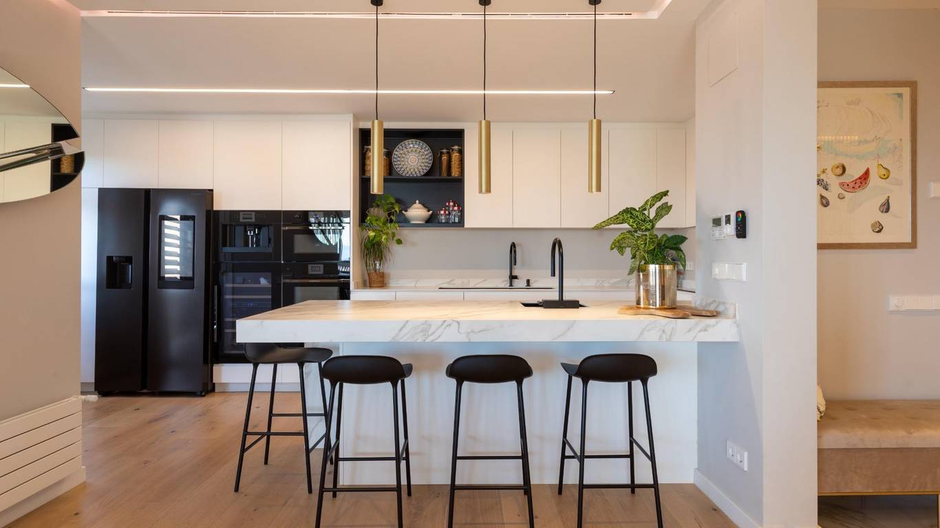 El salón, amplio y luminoso, con chimenea, cuenta con una puerta de vidrio que lo separa de la zona de noche e inunda de luz las zonas de paso. La cocina abierta, con barra, invita a cocinar mirando la vida: placa de inducción de 8 fuegos, placa teppanyaki, superficies de Neolith y electrodomésticos de alta gama de la marca Küppenbush que hacen fácil lo que debe lucir la galería completa el espacio con lavadora y secadora, orden sin renunciar a la estética. Música ambiente con sistema Sonos, temperatura de luz a tu gusto (Downled regulable) y la ciudad como decorado.