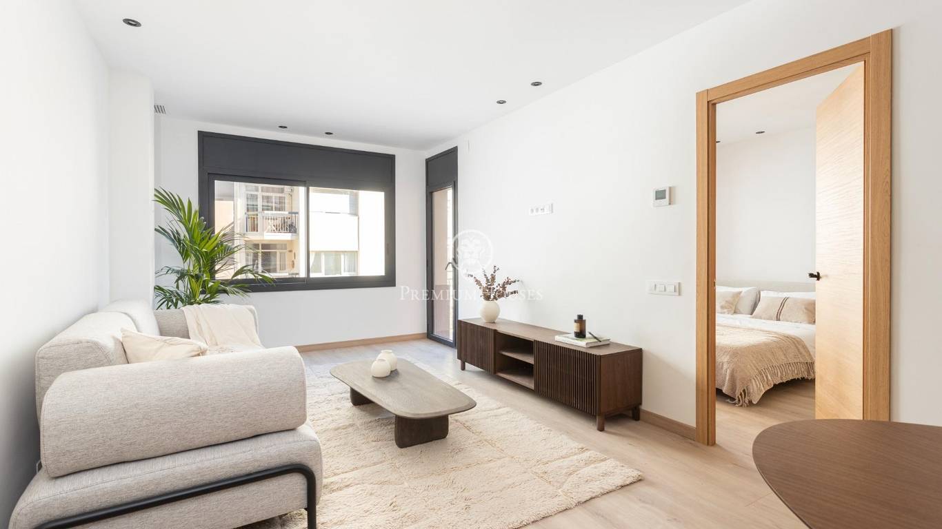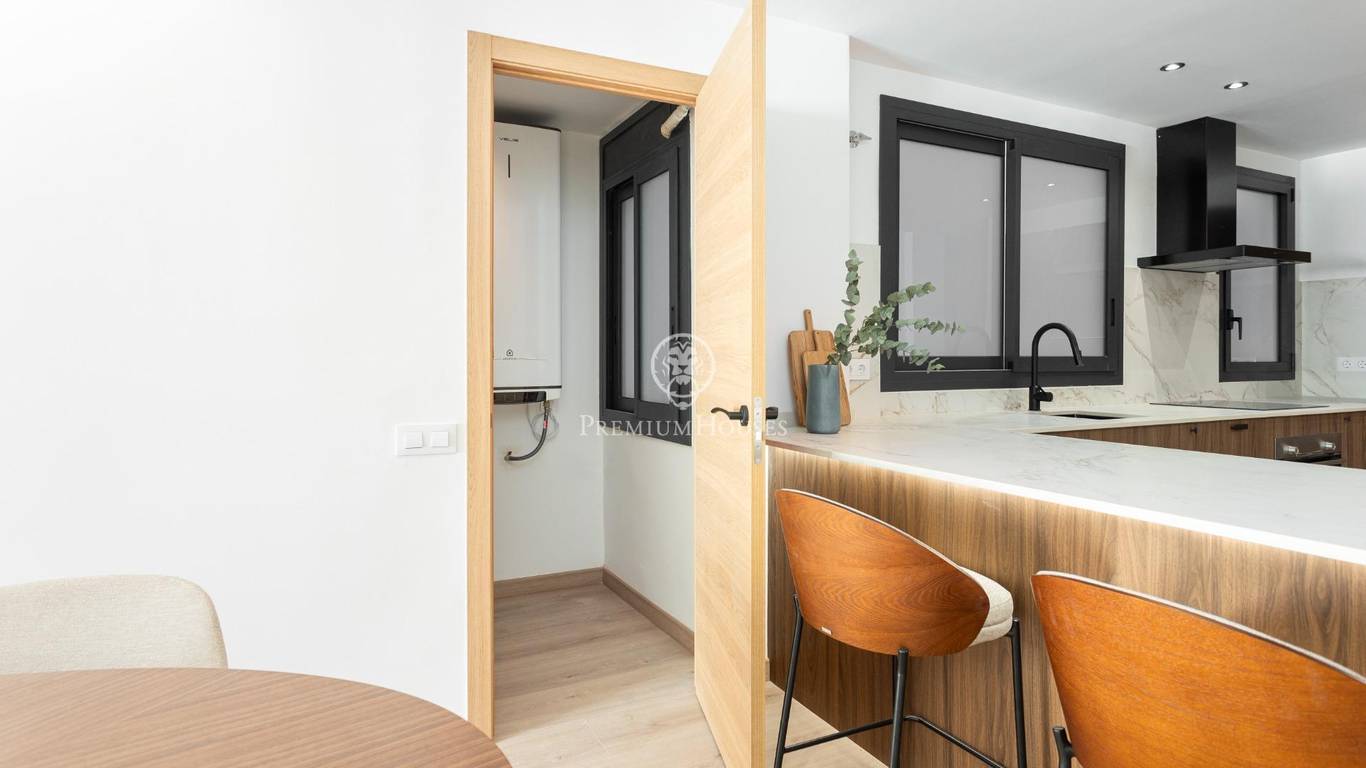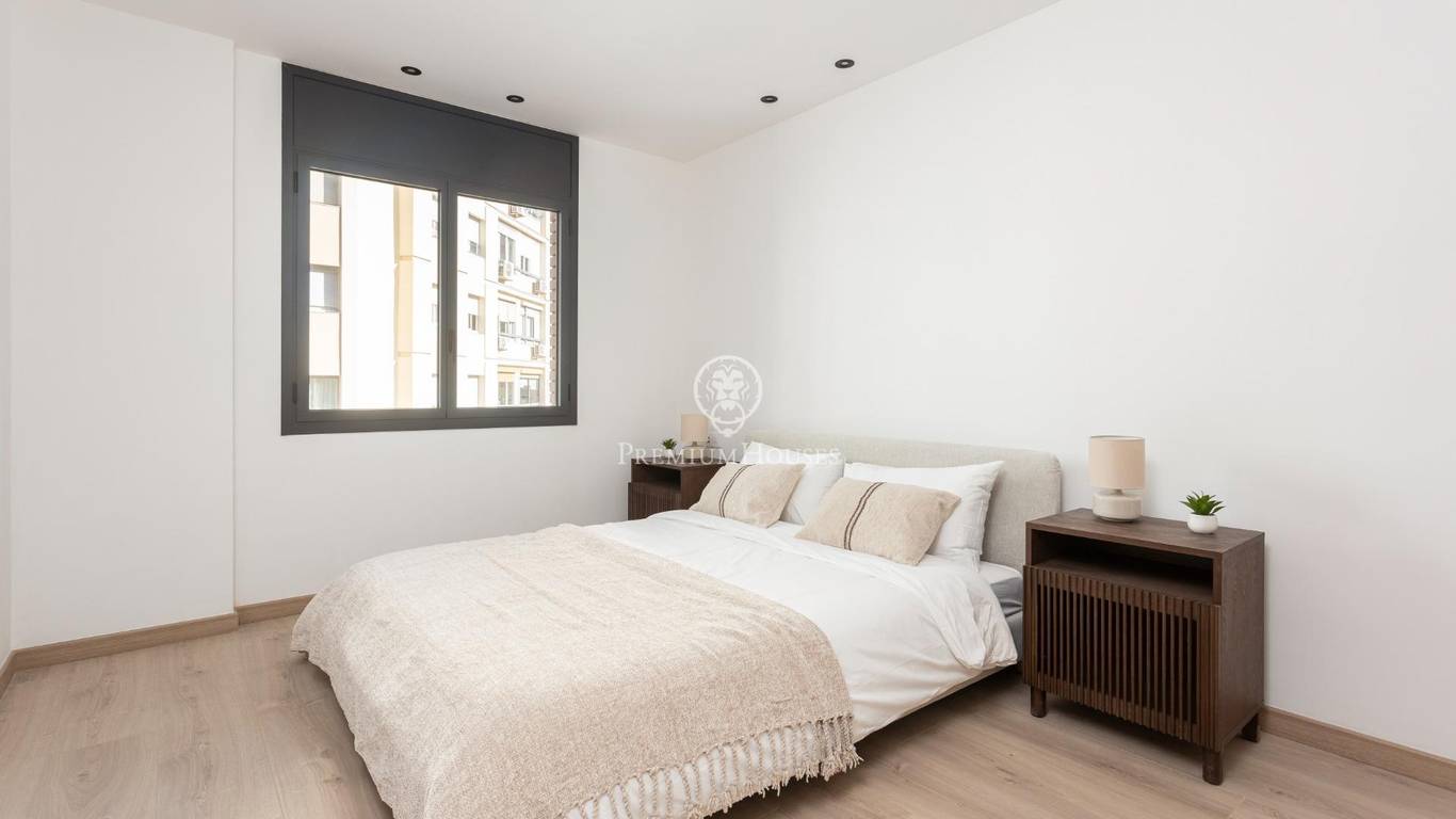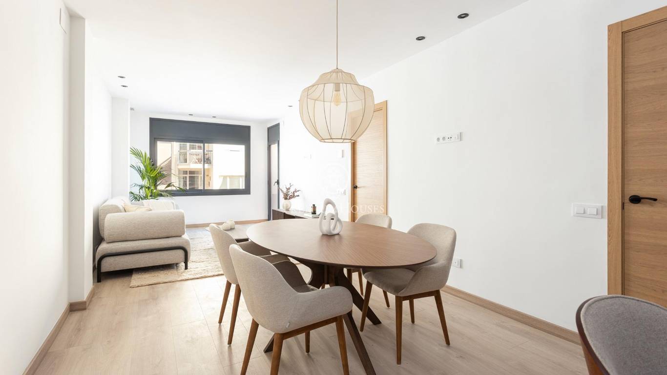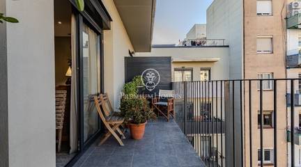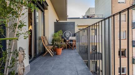 Exclusiva propiedad de 105m2 totalmente reformada con terraza, de gran luminosidad, acabados de alta calidad y muy buena distribución.Ubicada en un segundo piso (tercera planta real) de una finca esquinera del año 1975 con servicio de conserjería. Asimismo la propiedad incluye una plaza de parking para coche pequeño o moto en la misma finca.La zona de día encontramos un salón-comedor con un gran ventanal ideal para disfrutar de la luz natural durante todo el día y por el mismo se accede a la acogedora terraza. La cocina abierta, de diseño moderno y funcional, está totalmente integrada en el espacio con una práctica península y está equipada con electrodomésticos de la línea Bosch, incluyendo horno, placa de inducción, lavavajillas, campana extractora y microondas. La encimera es de la firma Dekton by Cosentino en sofisticado acabado mate. Además cuenta con un práctico lavadero independiente.La zona de noche se compone de: 1 amplia y luminosa habitación en suite, 1 habitación doble y 1habitación individual. Todas ellas con armarios empotrados. En total, la vivienda ofrece dos baños completos, prácticos y de diseño, con revestimiento porcelánico mate, grifería de ducha empotrada e iluminación led.La propiedad esta climatizada con aire acondicionado por conductos frío/calor de la marca Mitsubishi y dispone de cerramientos de aluminio de doble y cuadruple acristalamiento con rotura de puente térmico y aislamiento acustico.Ubicación inmejorable, en una de las zonas más demandadas de Barcelona, a pocos pasos de Passeig de Sant Joan y Plaça Tetuán, perfectamente comunicado y rodeado de todo tipo de comercios y servicios.Ideal para quienes buscan confort, elegancia y ubicación privilegiada.