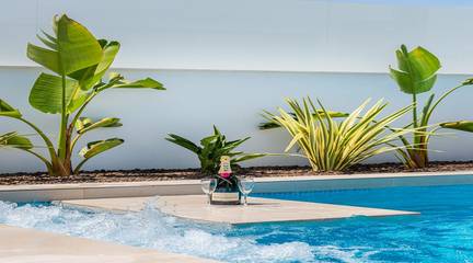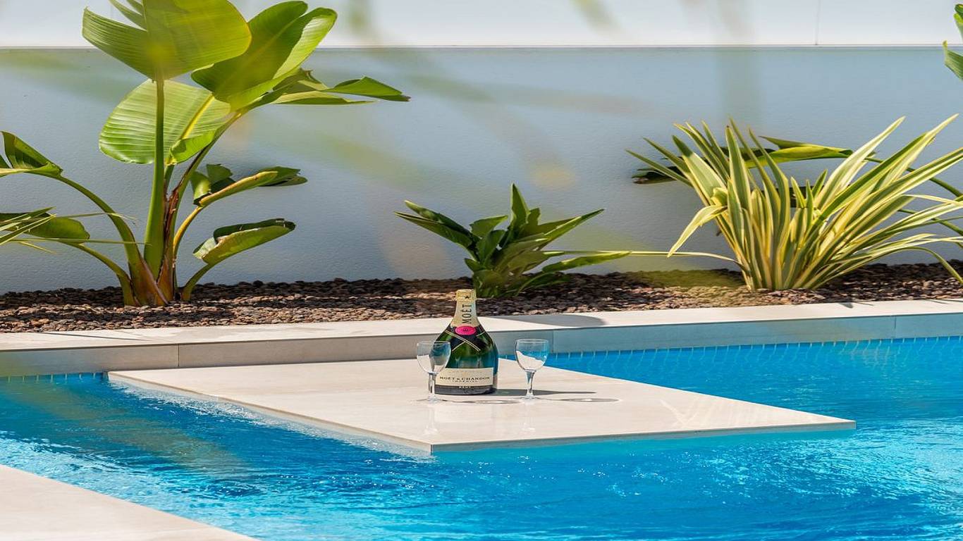 The properties comprise three double bedrooms (all with fitted wardrobes), two bathrooms (en-suite to the master bedroom) and a toilet, a fully equipped modern kitchen (with breakfast bar) and an open plan living/dining area, leading to the spacious tiled garden and private swimming pool.
