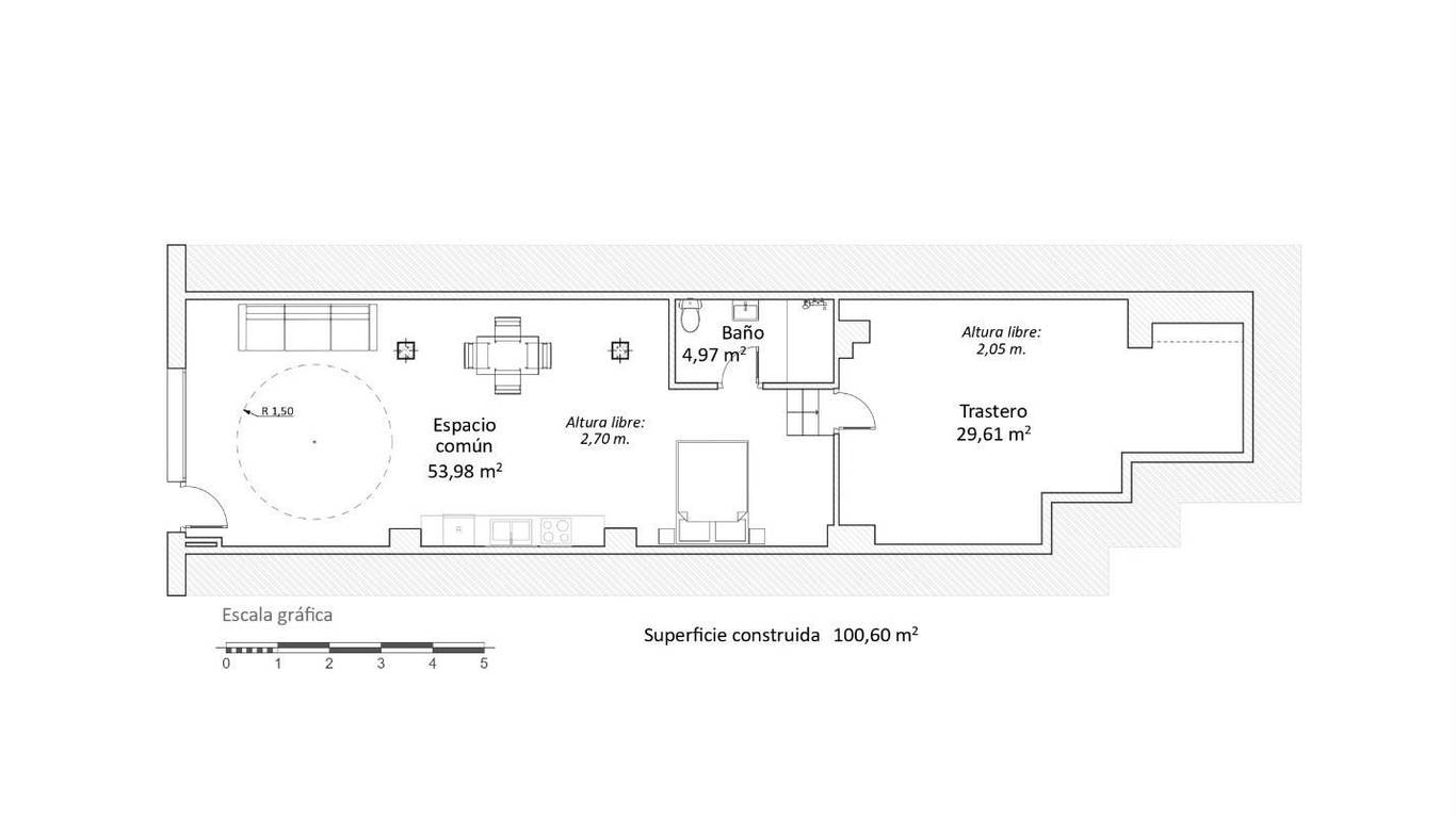 Adjacent to the main living area, there is a second spacious interior area. This highly versatile space can easily be adapted as a sleeping area, office, studio, or multifunctional room. In addition, it has water connections already installed, allowing the possibility of adding a second bathroom and a dressing area, further increasing the distribution options and comfort.